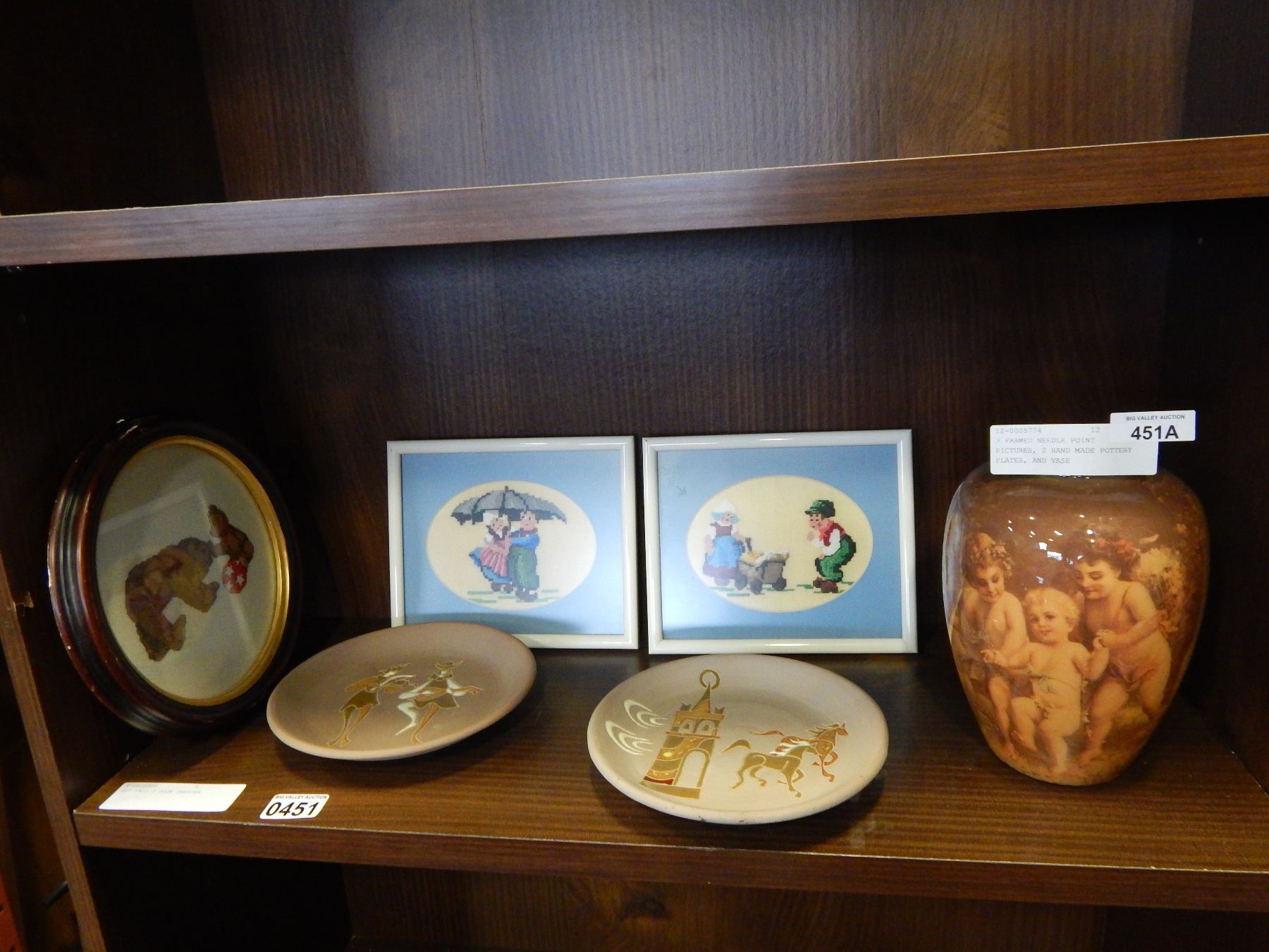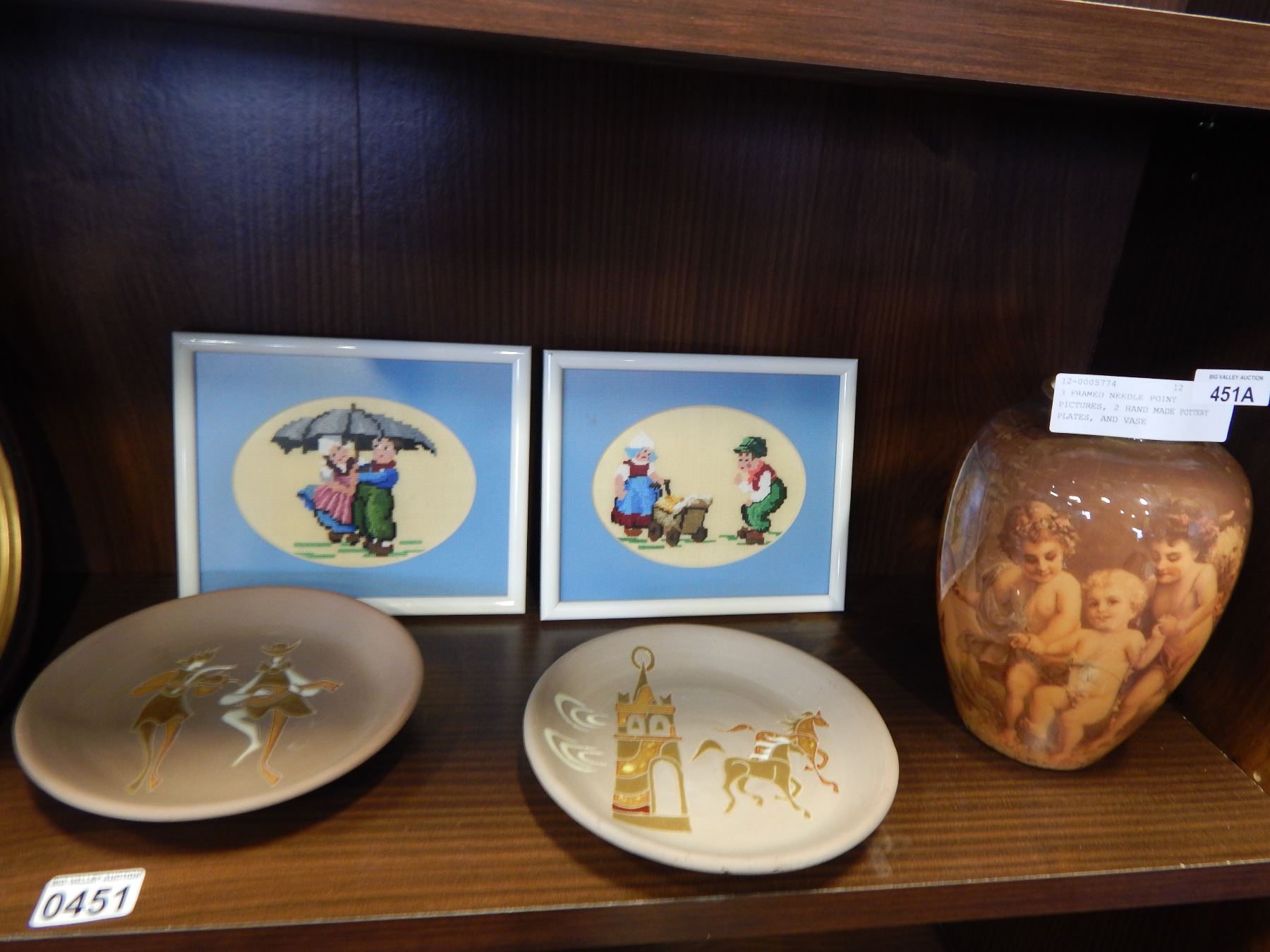 3 FRAMED NEEDLE POINT PICTURES, 2 HAND MADE POTTERY PLATES, AND VASE