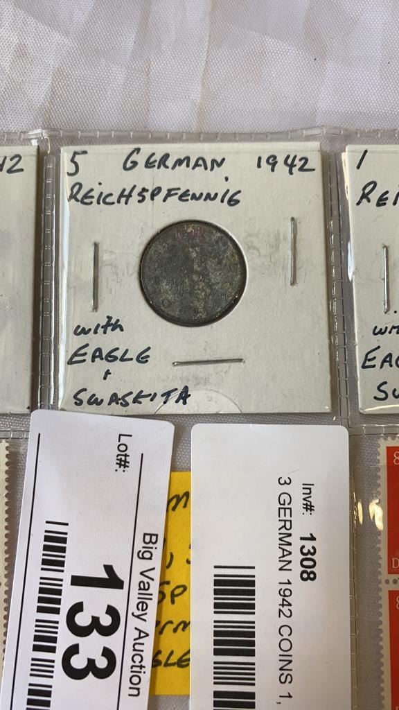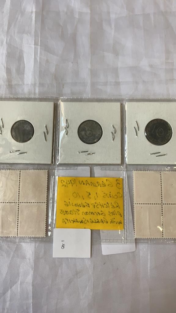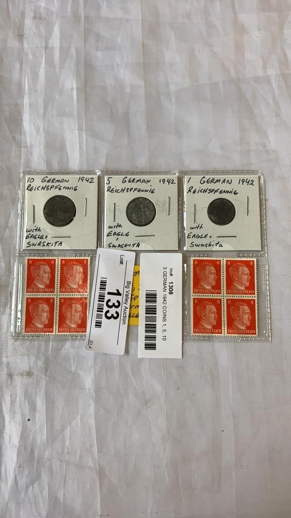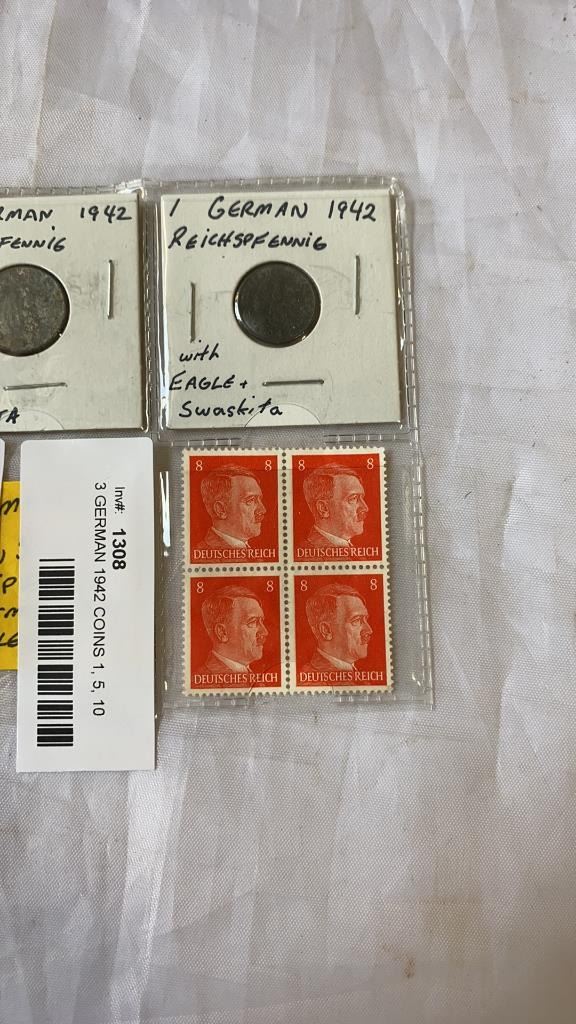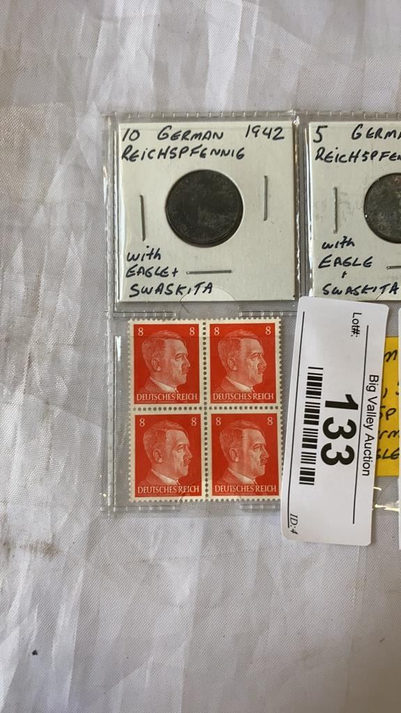 3 GERMAN 1942 COINS 1, 5, 10 REICHSPFENNIG AND 2 BLOCKS OF 4 STAMPS