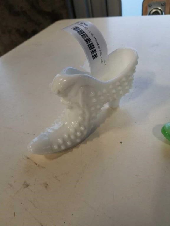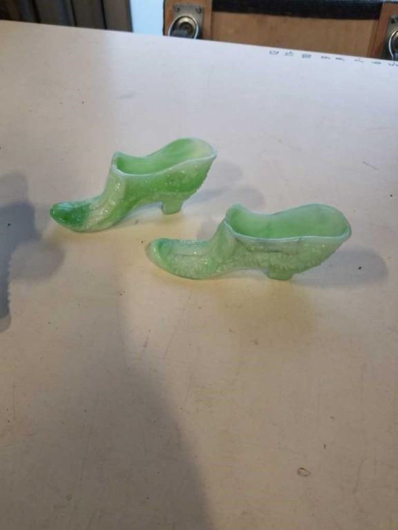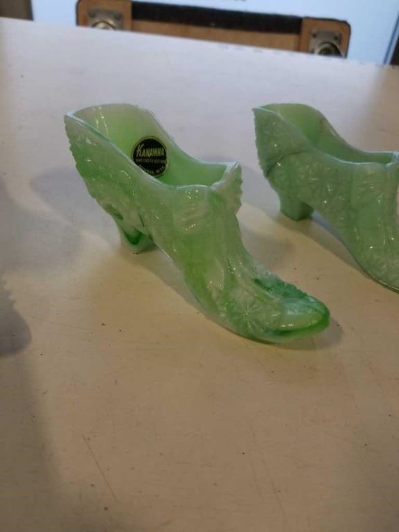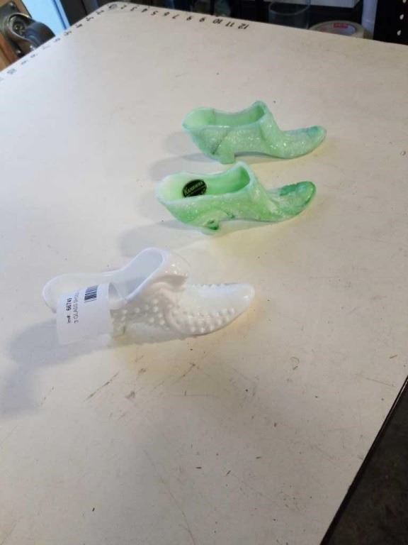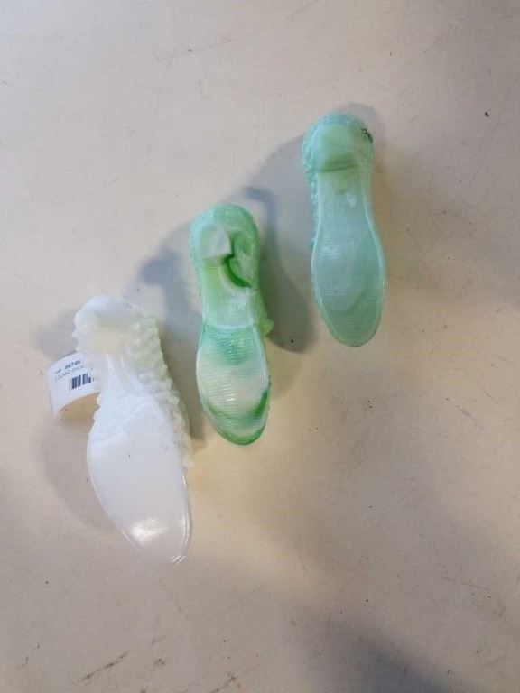 3 GLASS SHOES - 2 URANIUM GLASS, ONE MILK GLASS