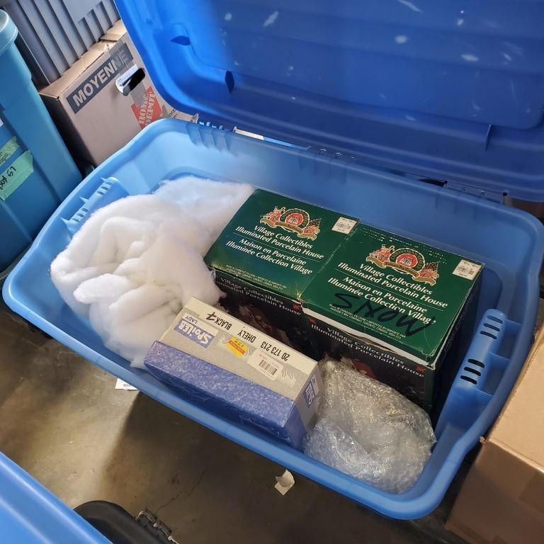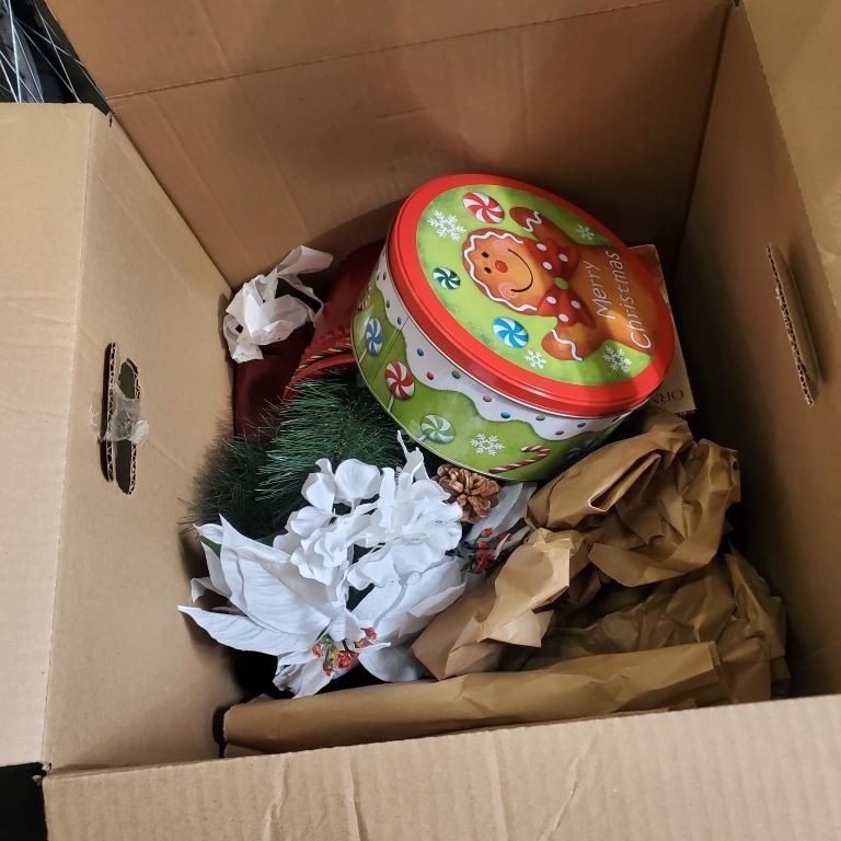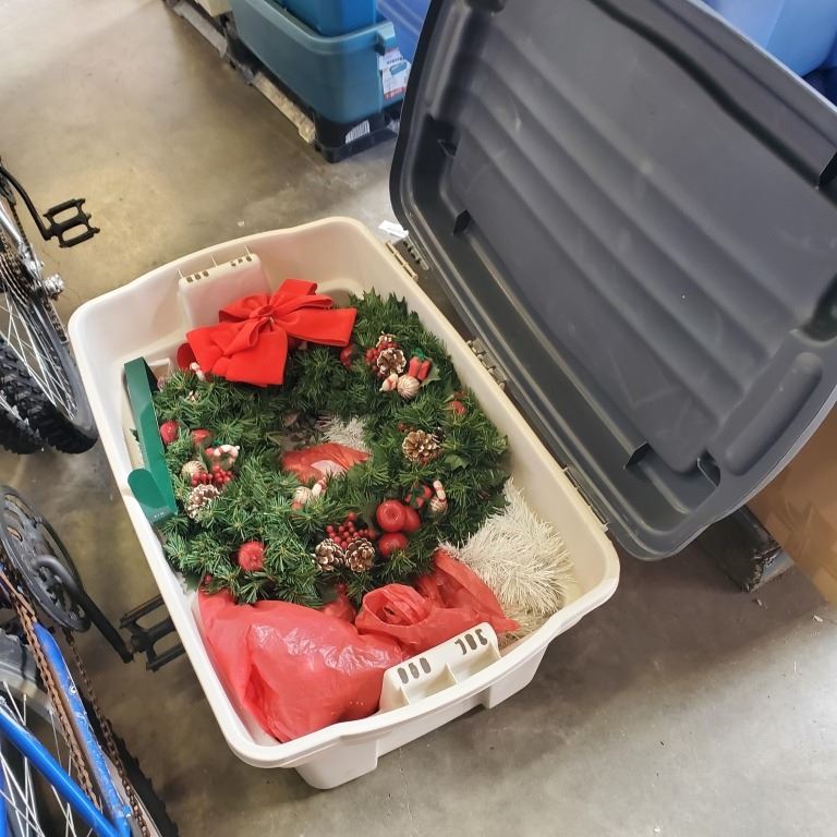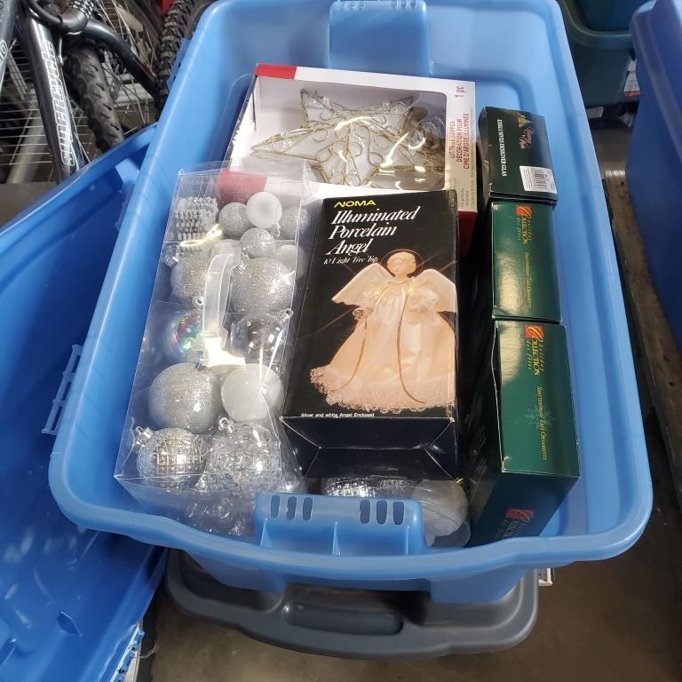 3 LARGE TOTES AND BOX OF CHRISTMAS DECOR