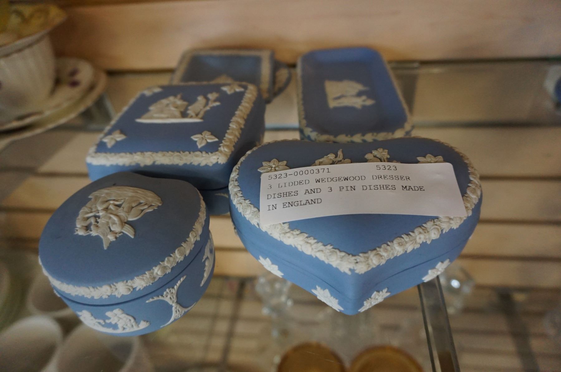 3 LIDDED WEDGEWOOD DRESSER DISHES AND 3 PIN DISHES MADE IN ENGLAND