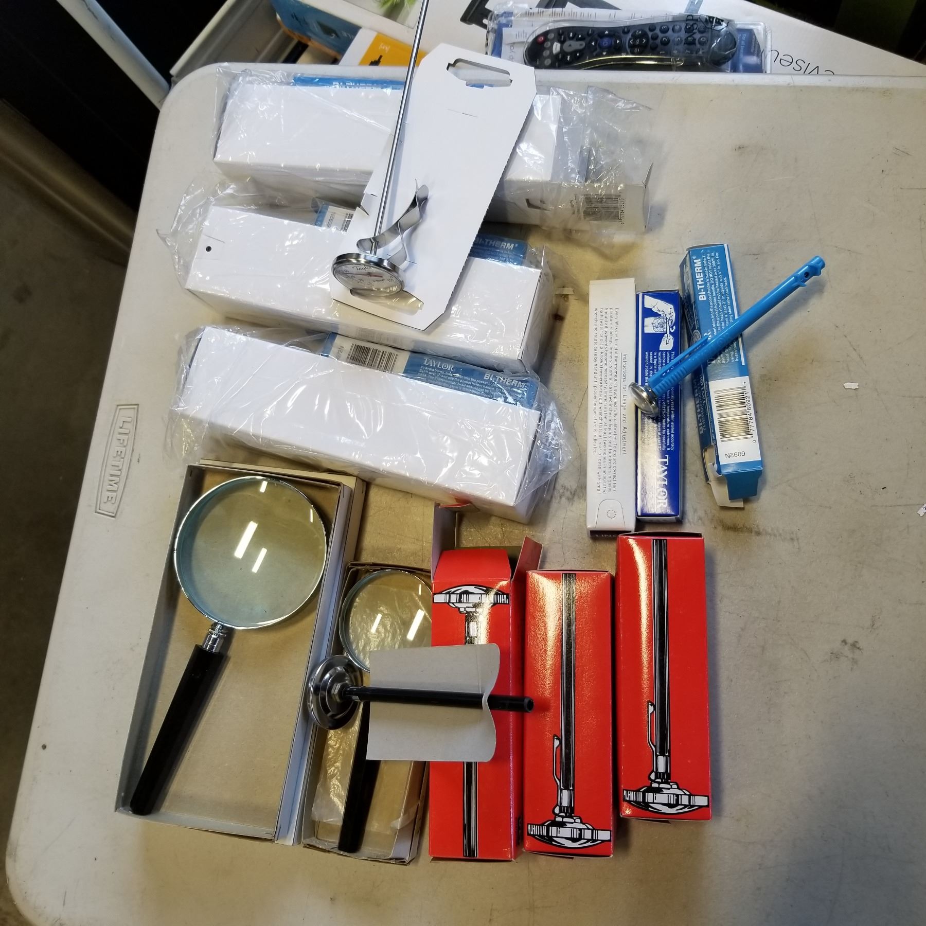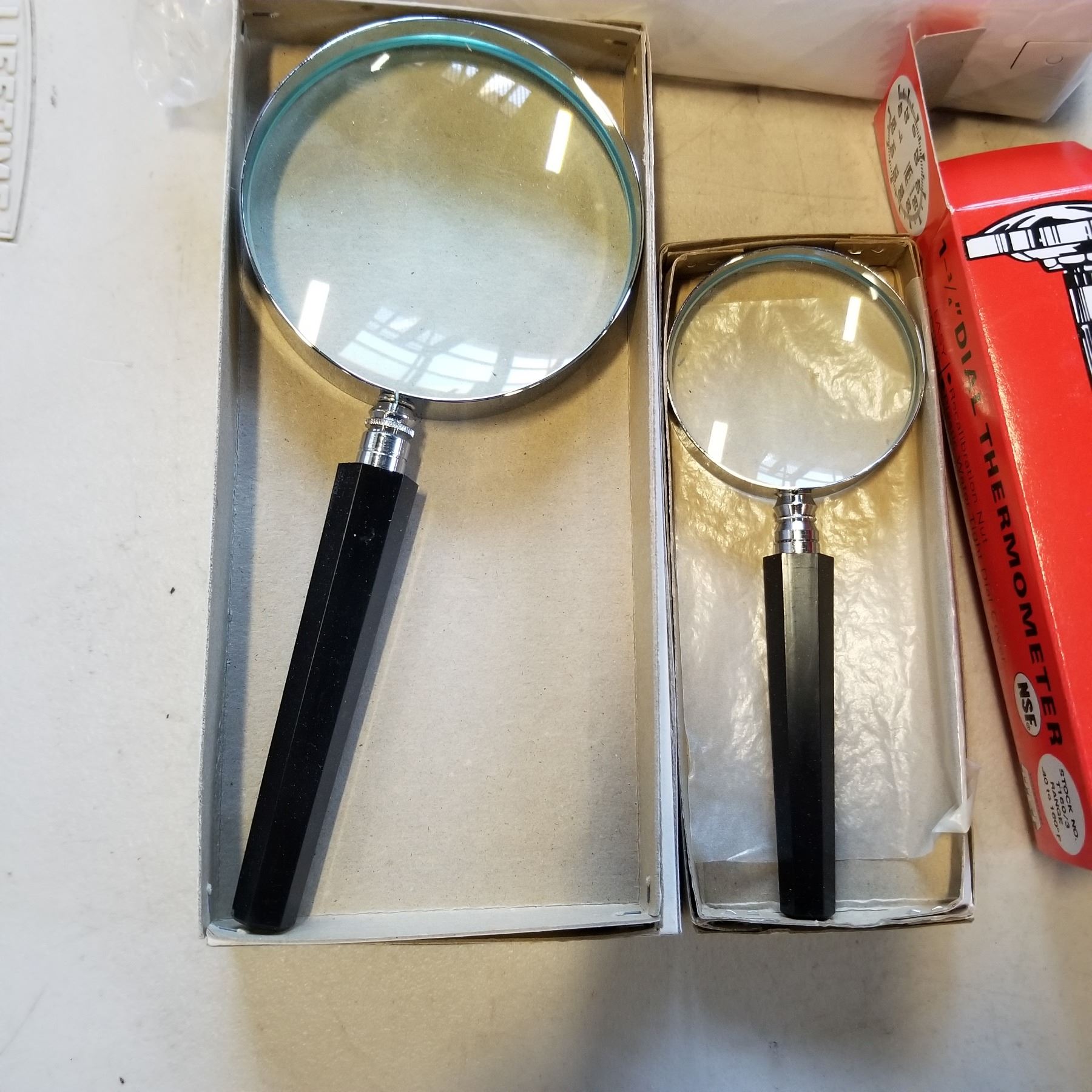 3 MAGNIFYING GLASSES AND 12 PORTABLE THERMOMETERS