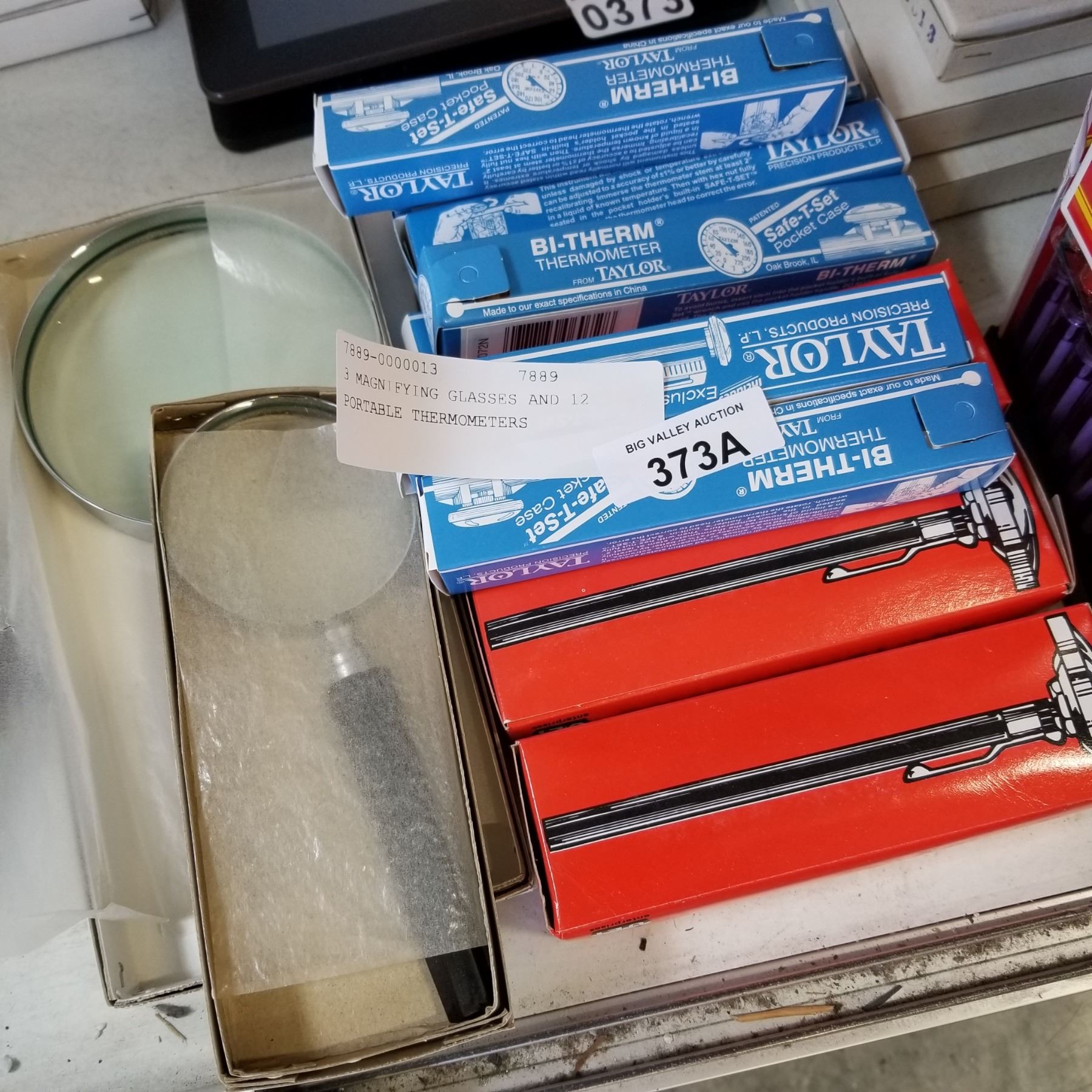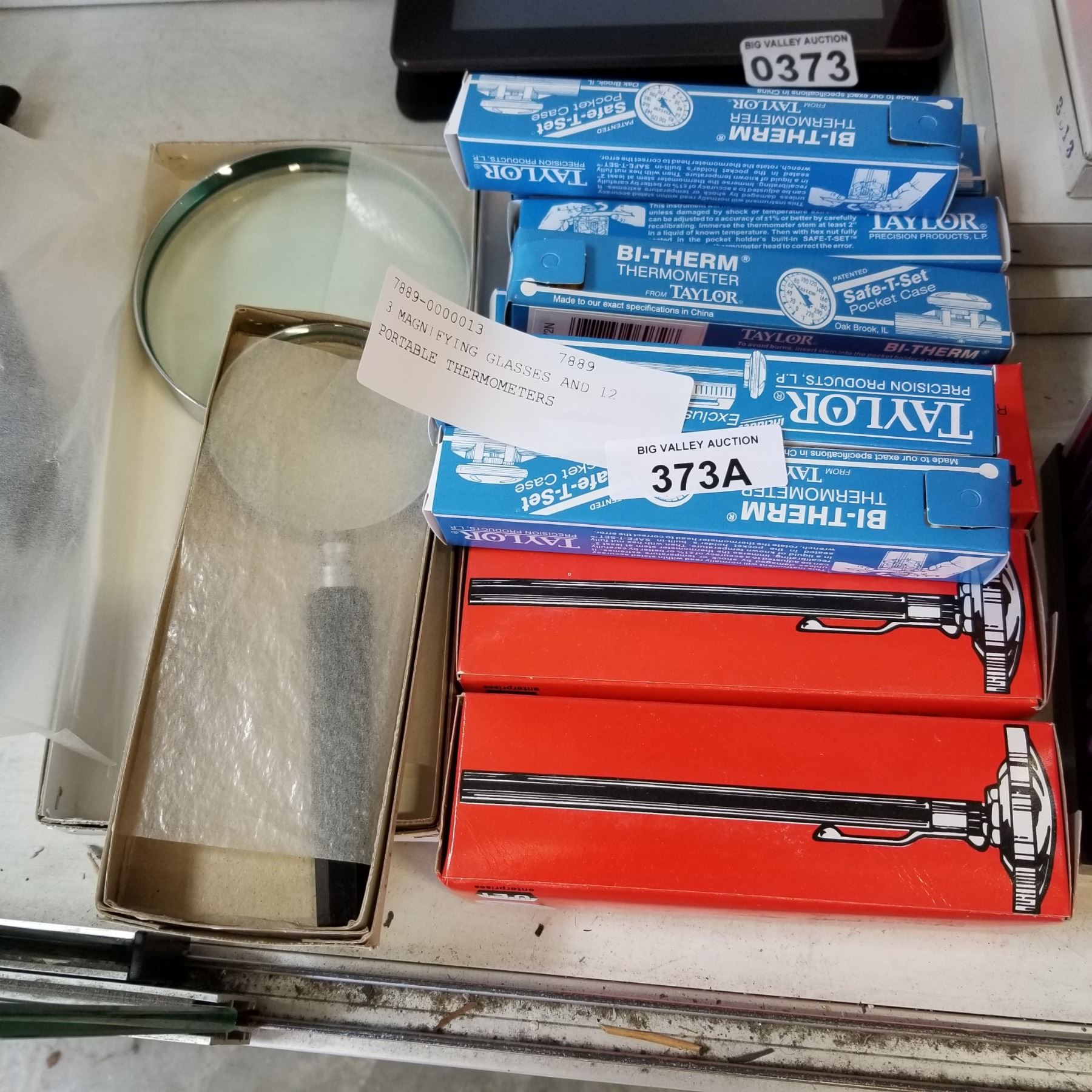 3 MAGNIFYING GLASSES AND 12 PORTABLE THERMOMETERS
