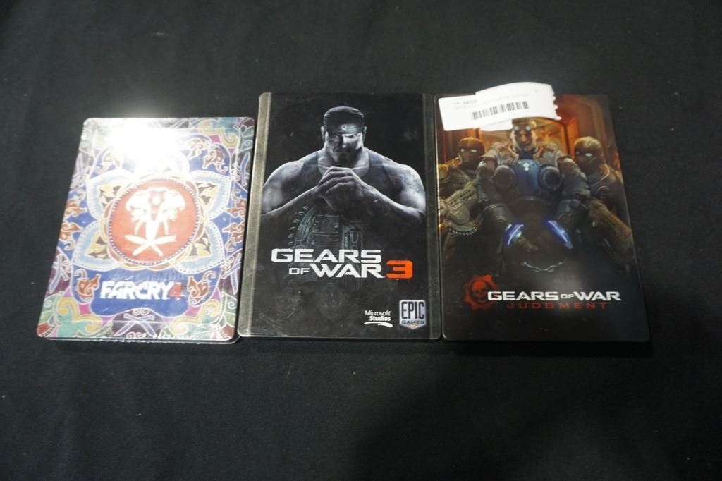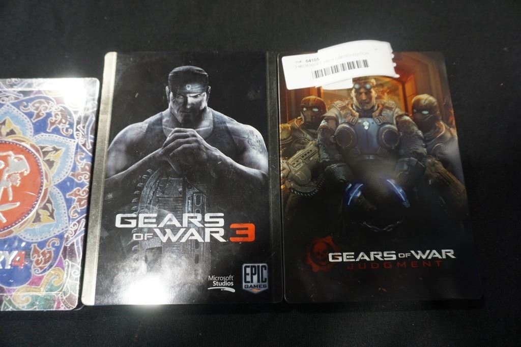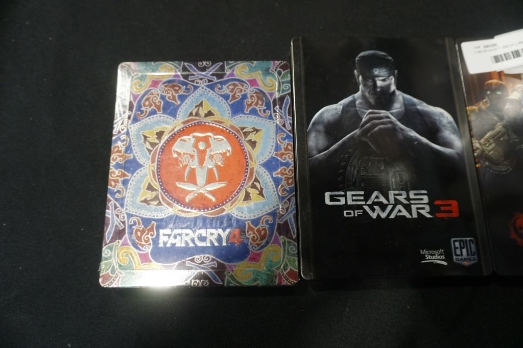 3 MICROSOFT XBOX LIMITED EDITION STEELBOX SERIES TITLES GEARS OF WAR 3, GEARS OF WAR JUDGEMENT AND FARCRY 4: FARCRY 4 IS SEALED, GEARS OF WAR 3 CASE AND GAME ARE THERE AND GEARS OF WAR JUDGEMENT IS JUST THE CASE