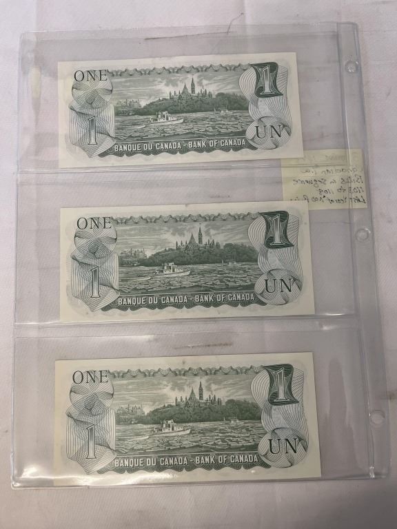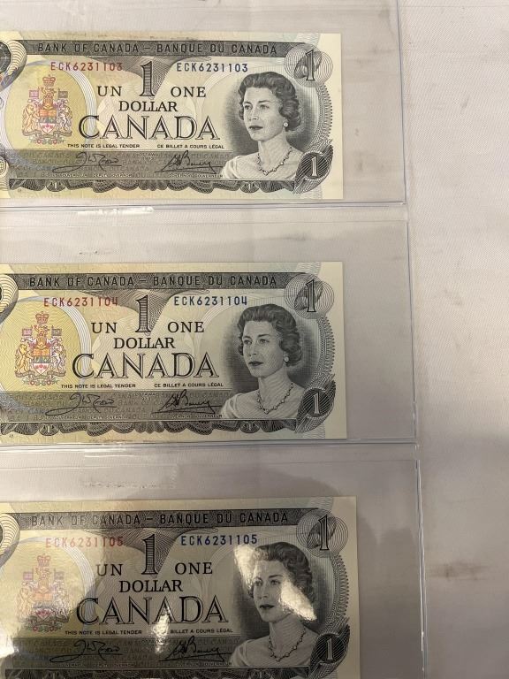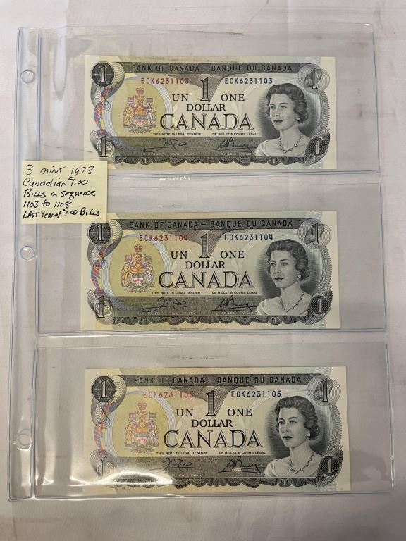 3 MINT 1973 CANADIAN $1 BILLS IN SEQUENCE, LAST YEAR OF $1 BILL