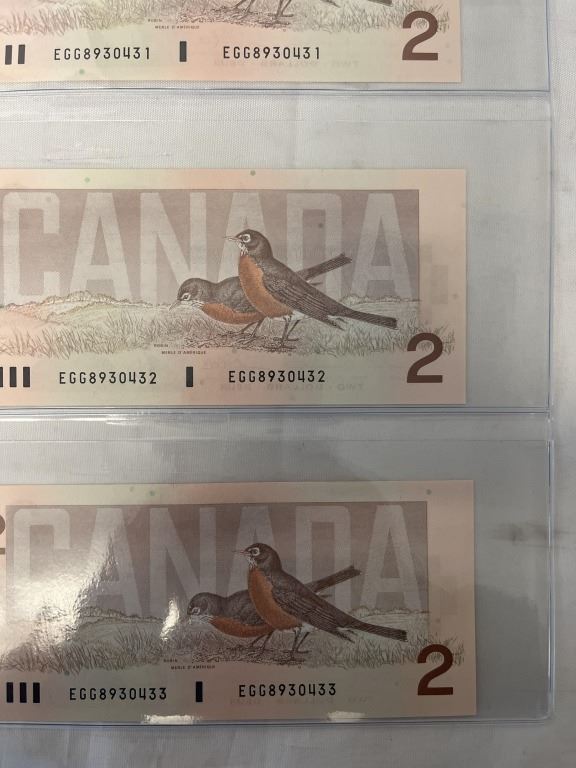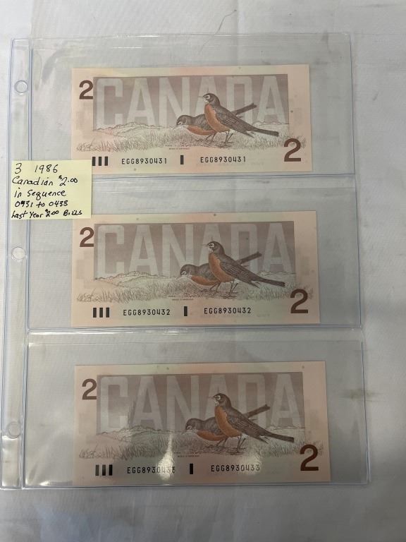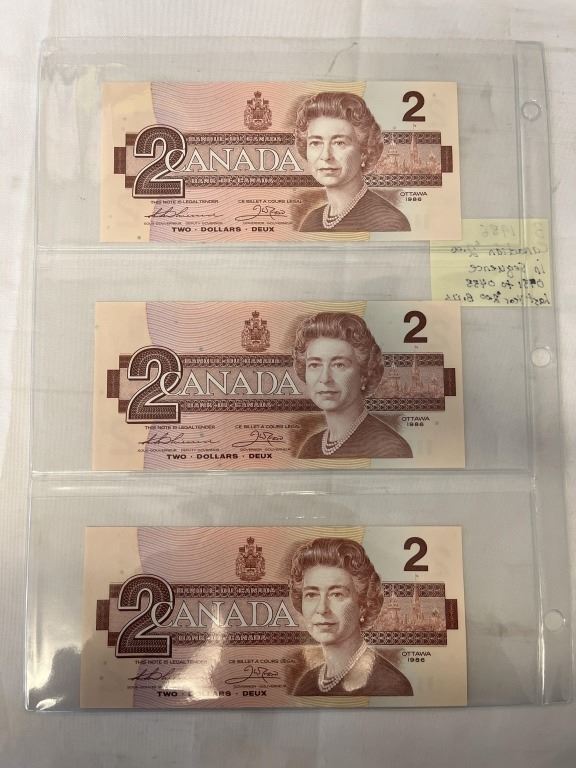 3 MINT 1986 $2 BILLS IN SEQUENCE, LAST YEAR OF 2 BILLS