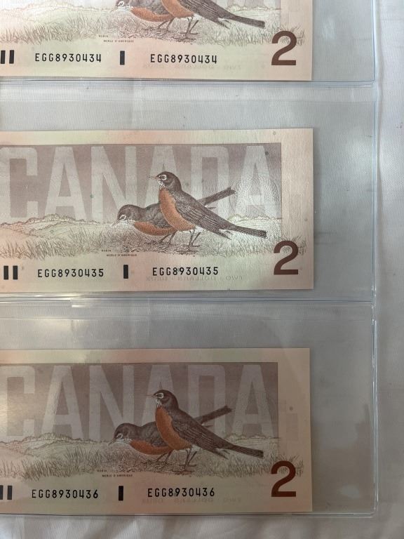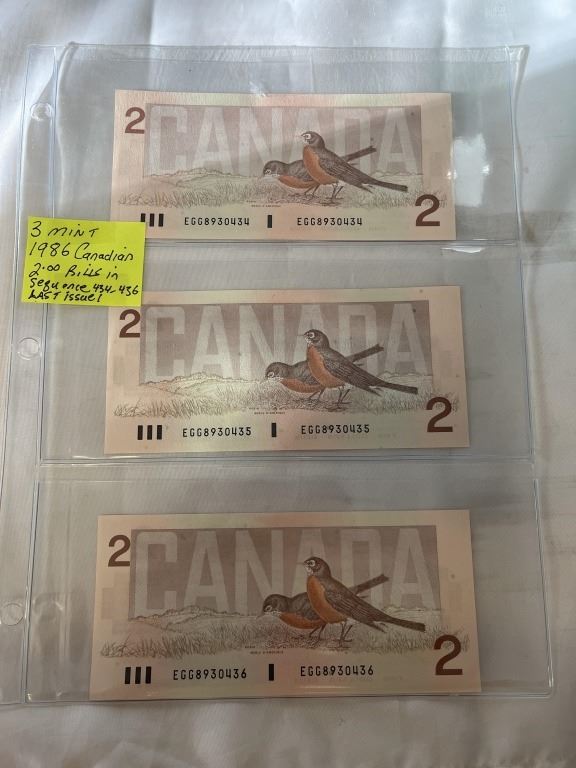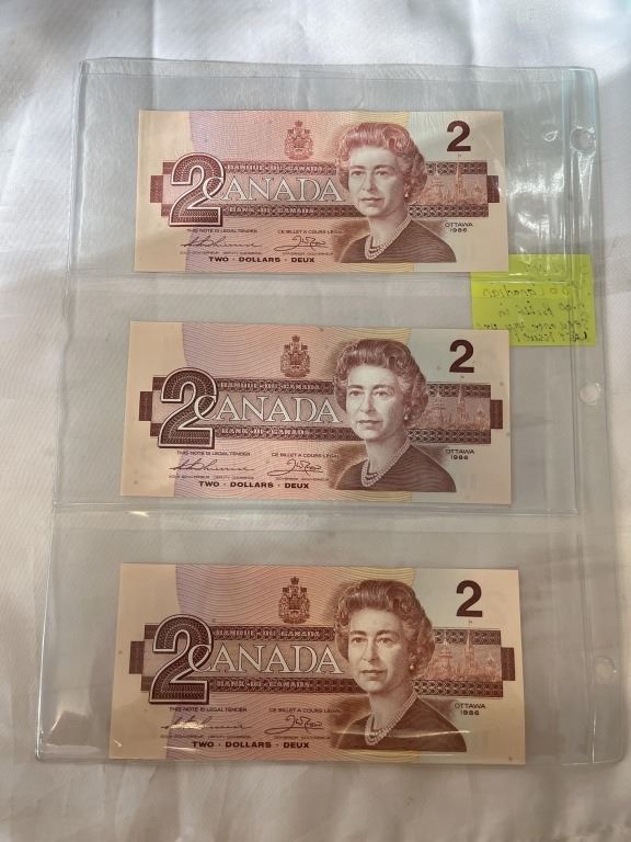 3 MINT 1986 CANADIAN $2 BILLS IN SEQUENCE 434-436