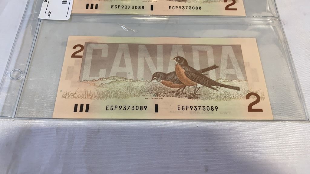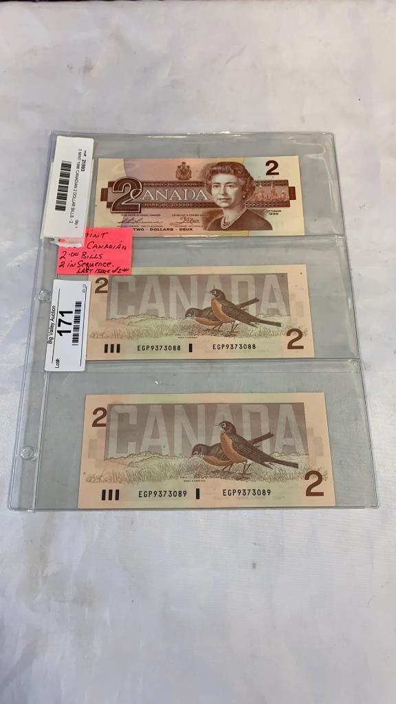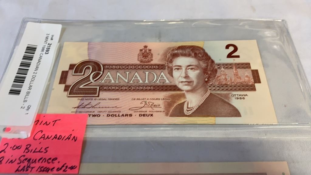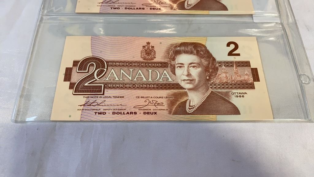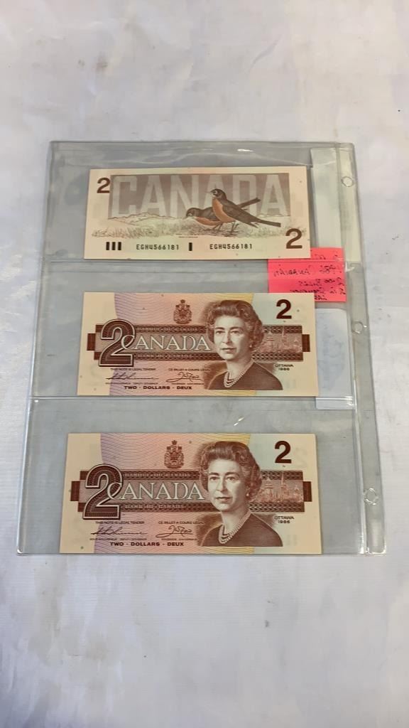 3 MINT 1986 CANADIAN 2 DOLLAR BILLS - 2 IN SEQUENCE, LAST ISSUE OF BILL
