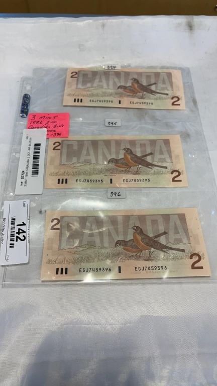 3 MINT 1986 CANADIAN 2 DOLLAR BILLS IN SEQUENCE