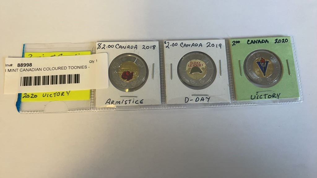 3 MINT CANADIAN COLOURED TOONIES - 2018 ARMISTICE, 2019 D-DAY, 2020 VICTORY