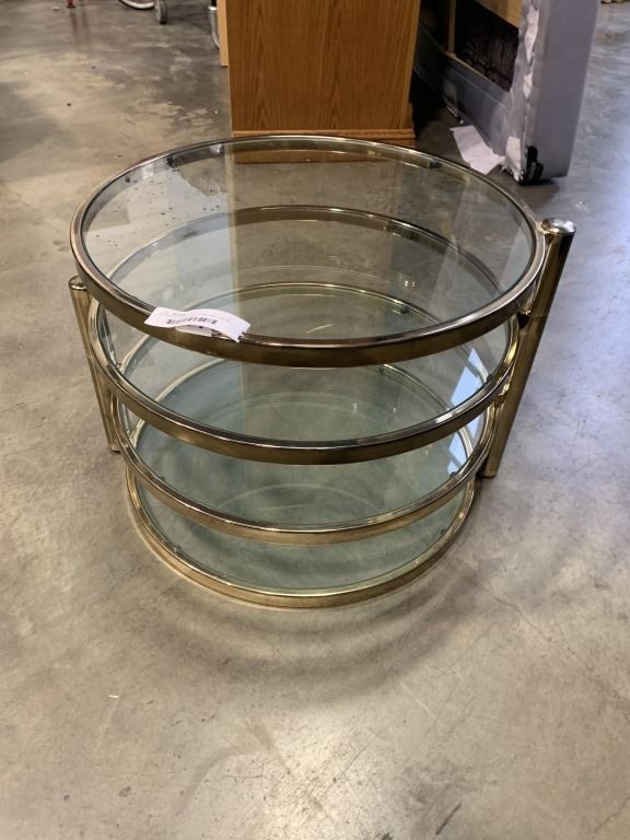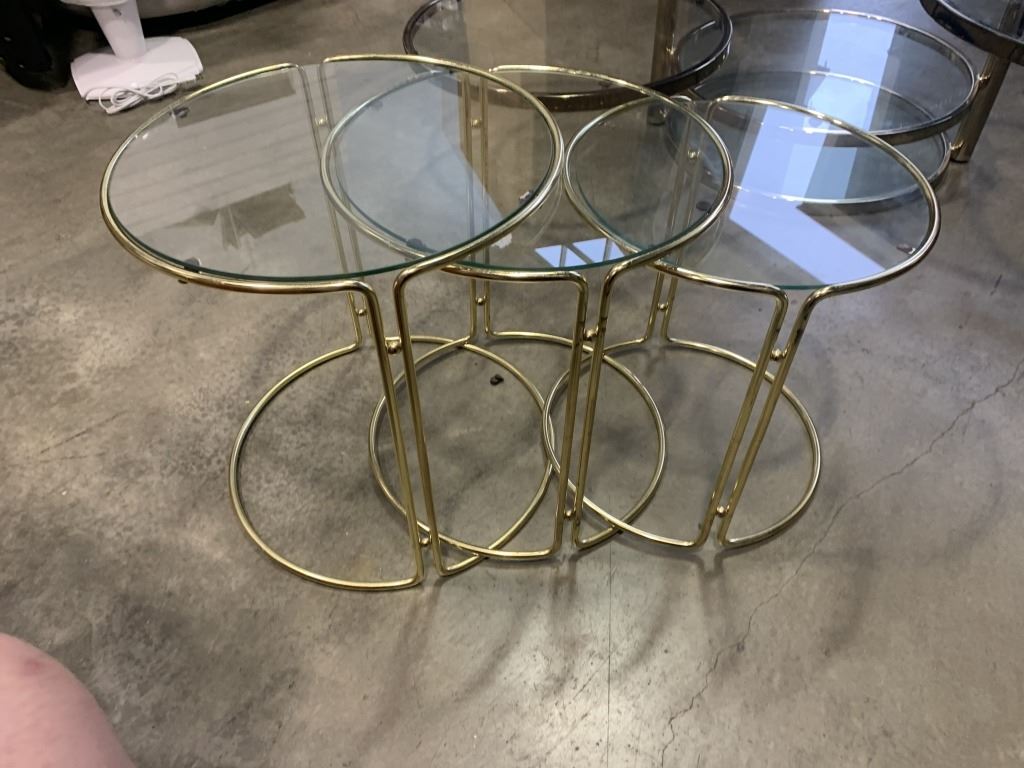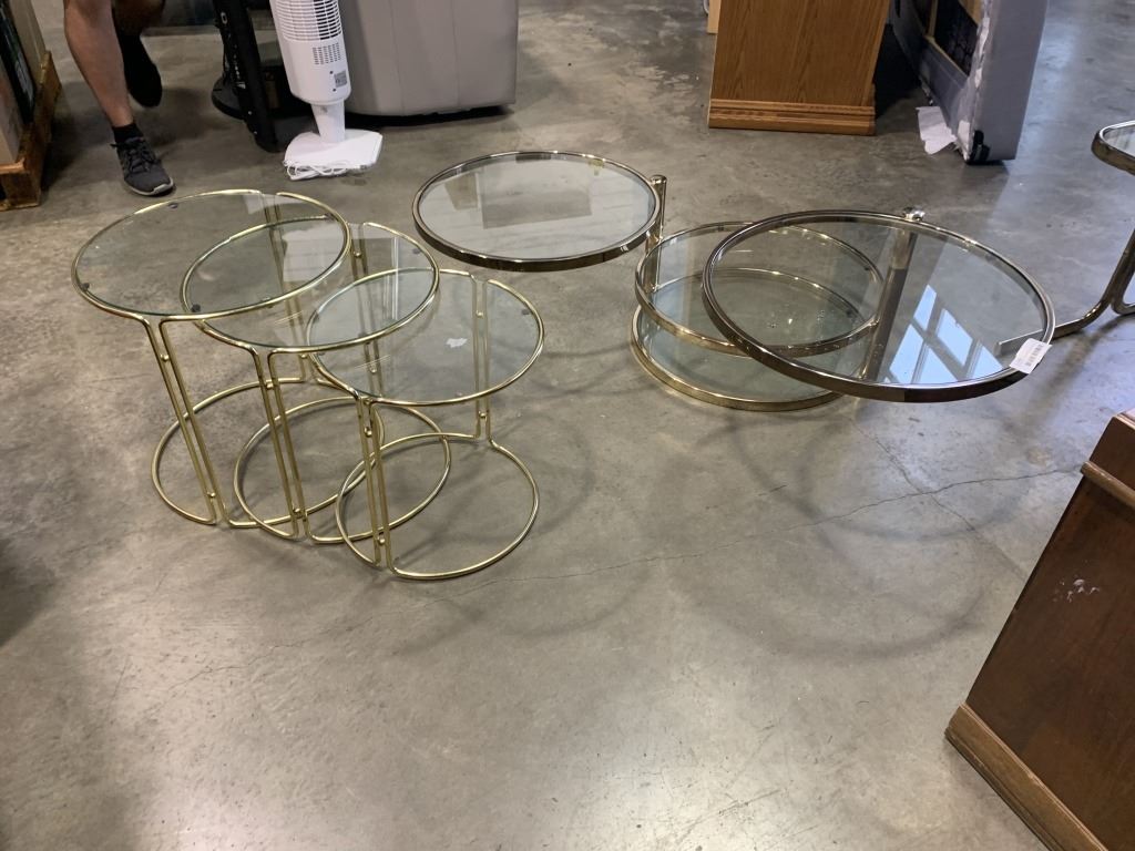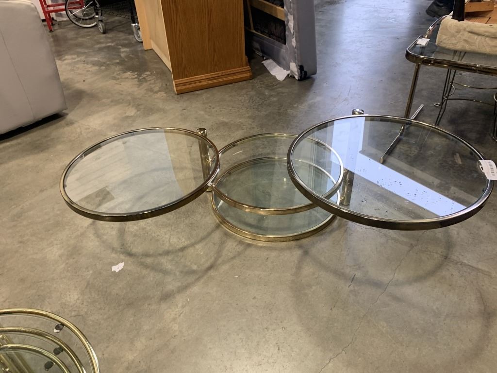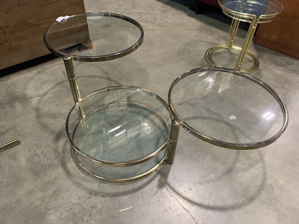 3 NESTING BRASS AND GLASS END TABLES AND SWIVEL 3 TIER END TABLE