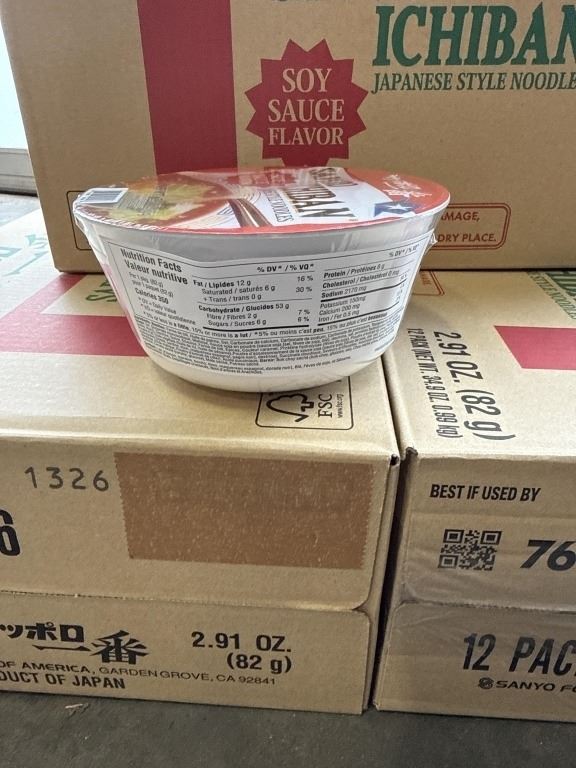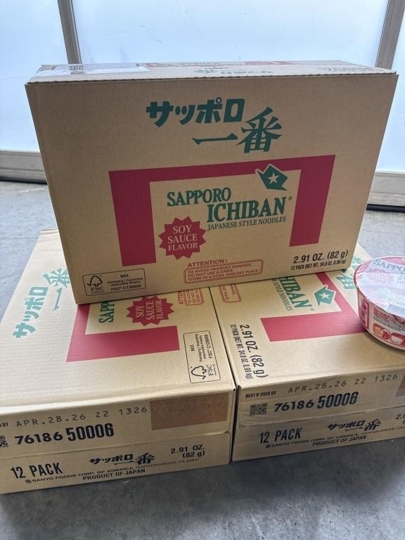 3 NEW CASES OF SAPPORO ICHIBAN SOY SAUCE FLAVOR JAPANESE STYLE NOODLE BOWLS, 12 PER BOX, 36 TOTAL BOWLS, BB APRIL 28.2026