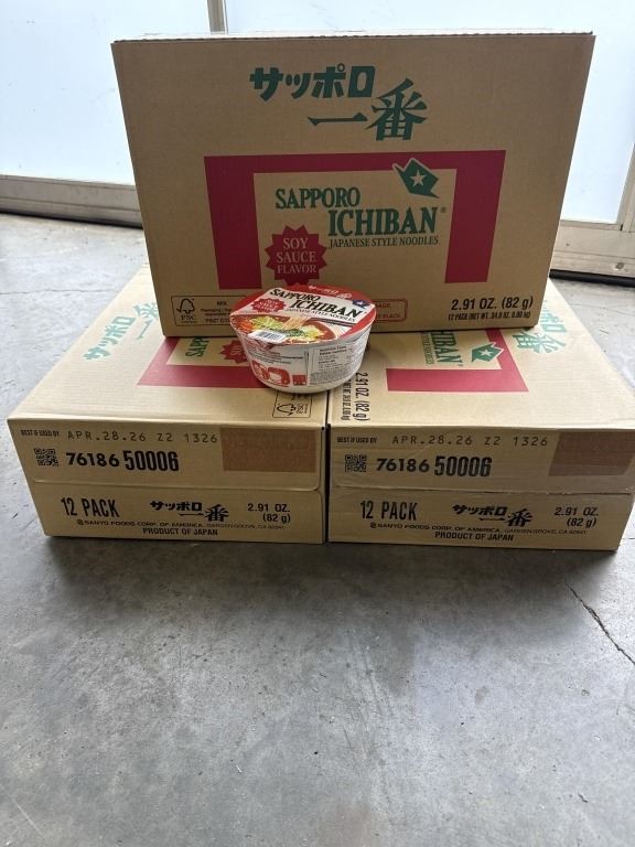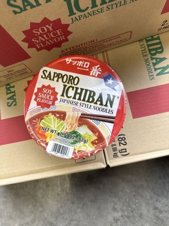 3 NEW CASES OF SAPPORO ICHIBAN SOY SAUCE FLAVOR JAPANESE STYLE NOODLE BOWLS, 12 PER BOX, 36 TOTAL BOWLS, BB APRIL 28.2026