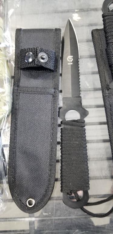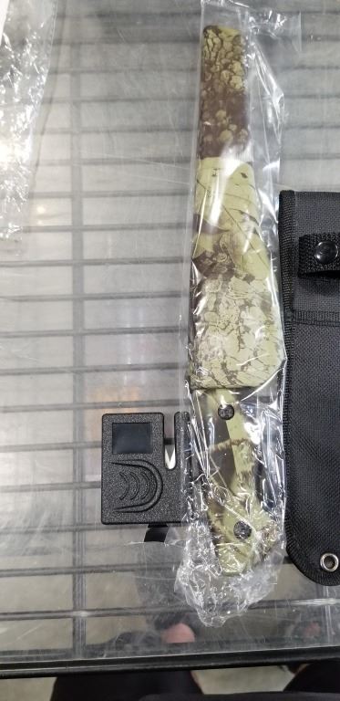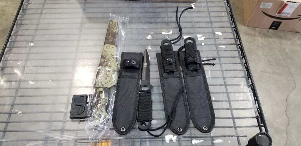 3 NEW THROWING KNIVES AND NEW CAMO KNIFE WITH SHEATH