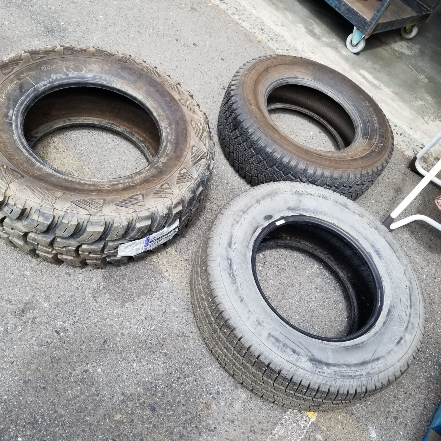 3 NEW TIRES - KUMHO ROAD VENTURE MT 35 x 12.5 R18, NOKIAN HAKKAPELIITIA 265/70 R17, AND GOODYEAR 265/70 R17 TIRE