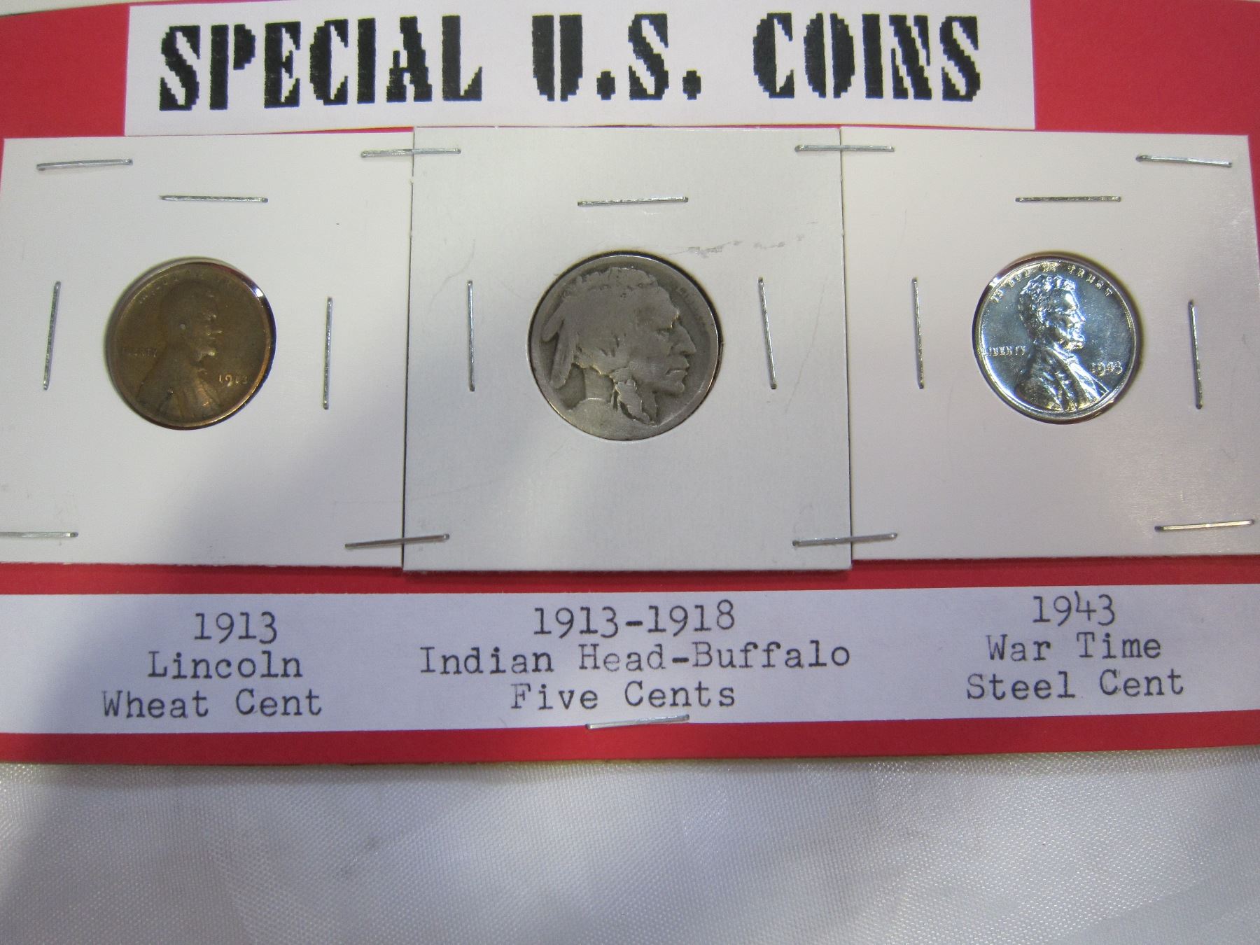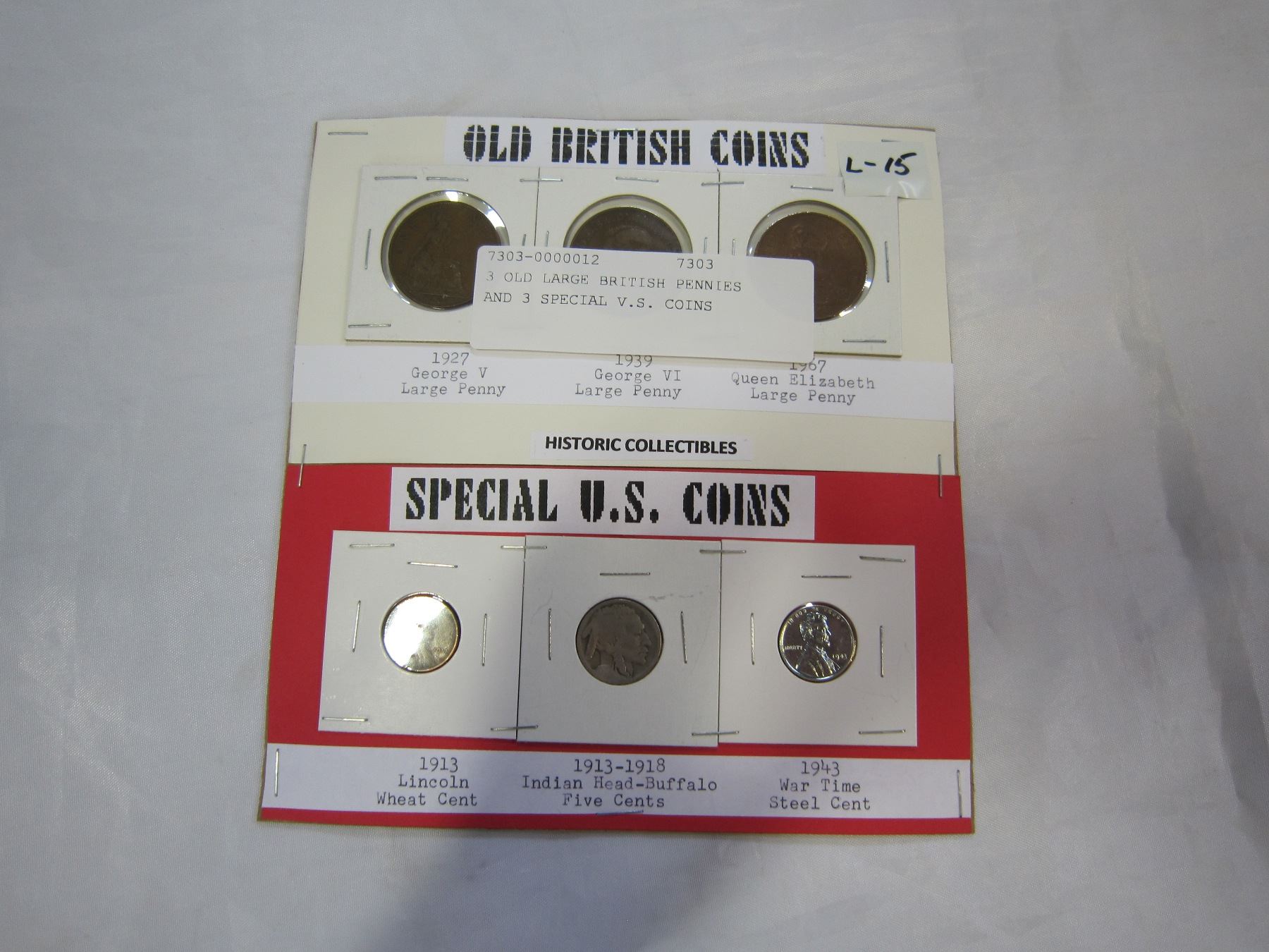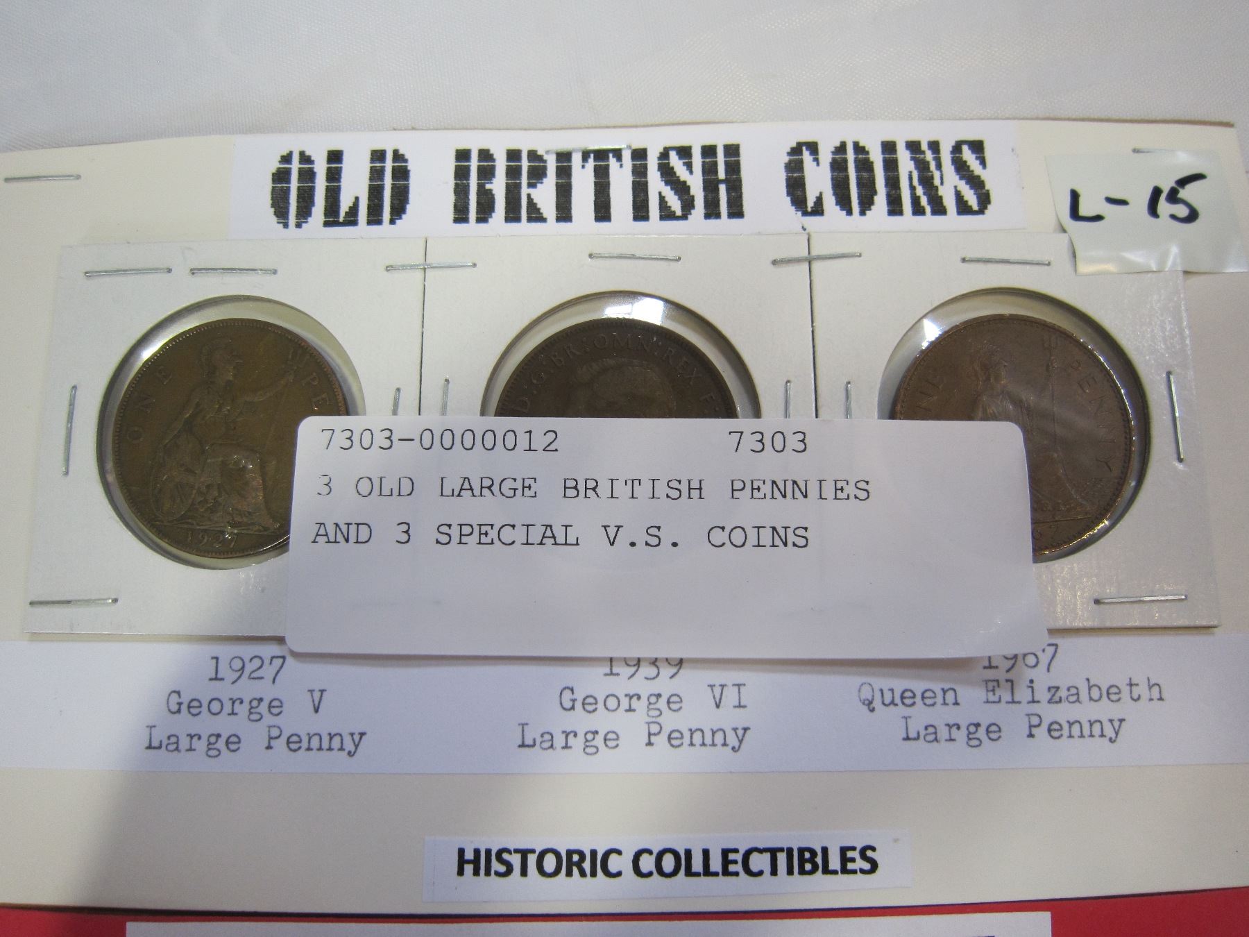 3 OLD LARGE BRITISH PENNIES AND 3 SPECIAL V.S. COINS