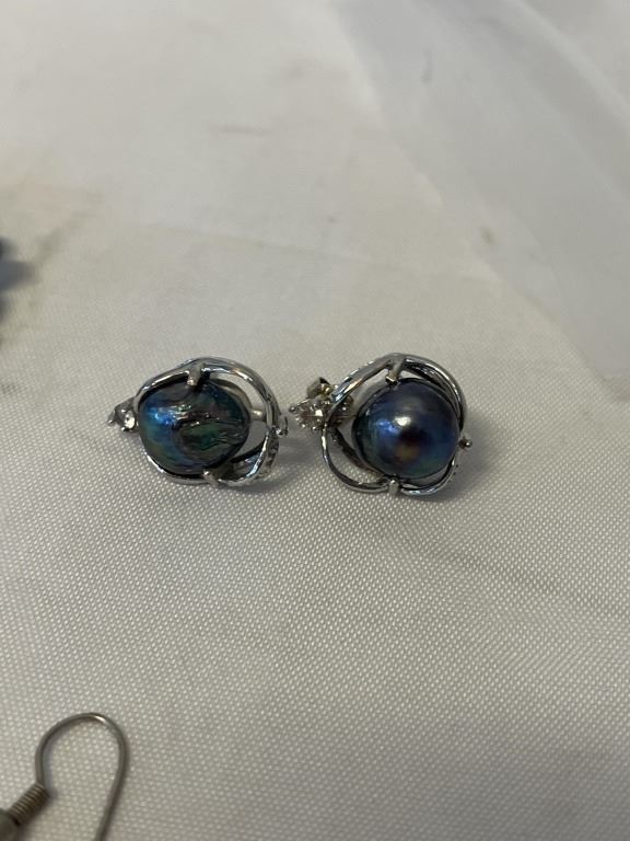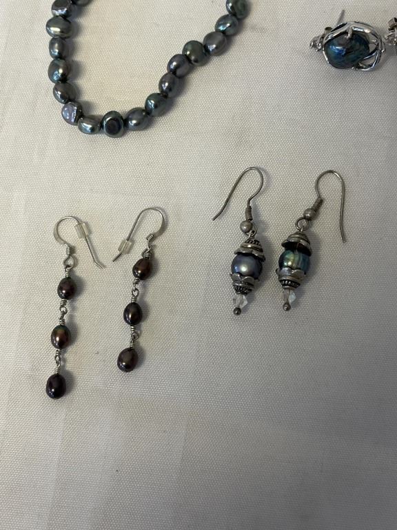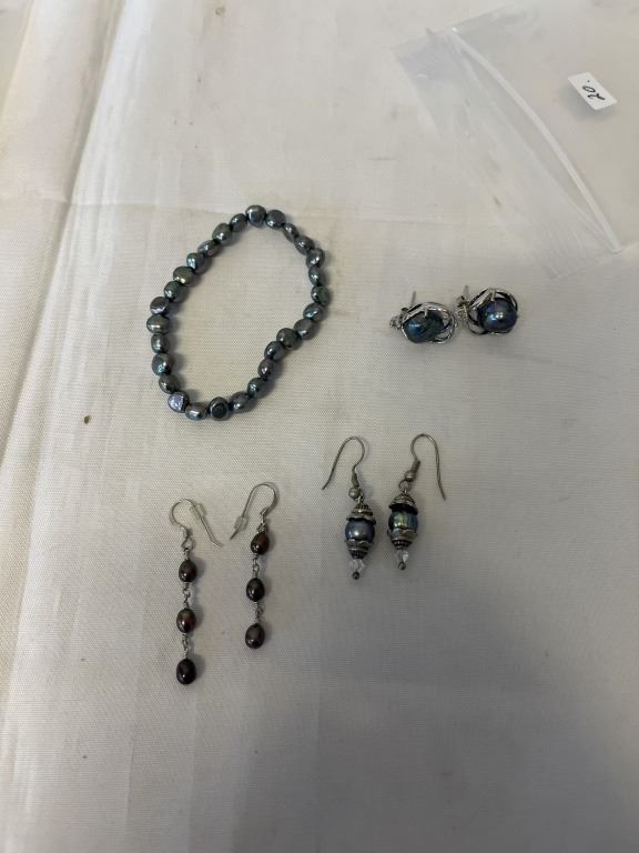 3 PAIRS OF VINTAGE SILVER W/ BLACK PEARLS EARRINGS AND BRACELET