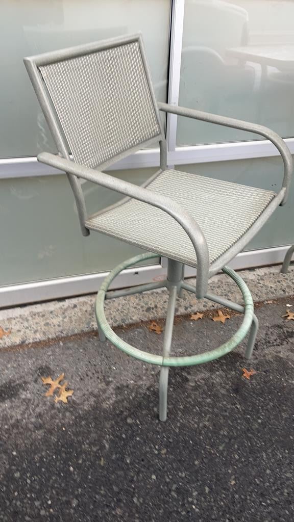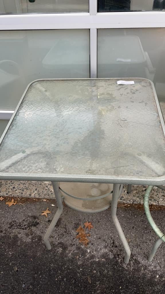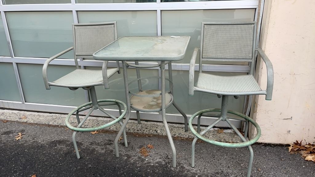 3 PIECE GREEN METAL PATIO SET - GLASSTOP TABLE AND 2 SWIVEL STOOLS