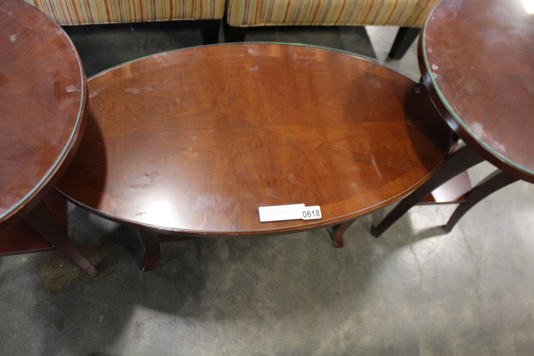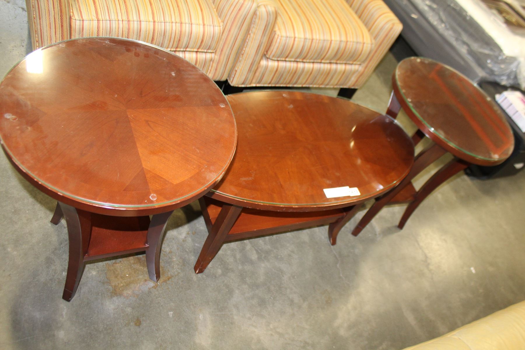 3 PIECE OVAL GLASS TOP CHERRY FINISH COCKTAIL COFFEE TABLE SET