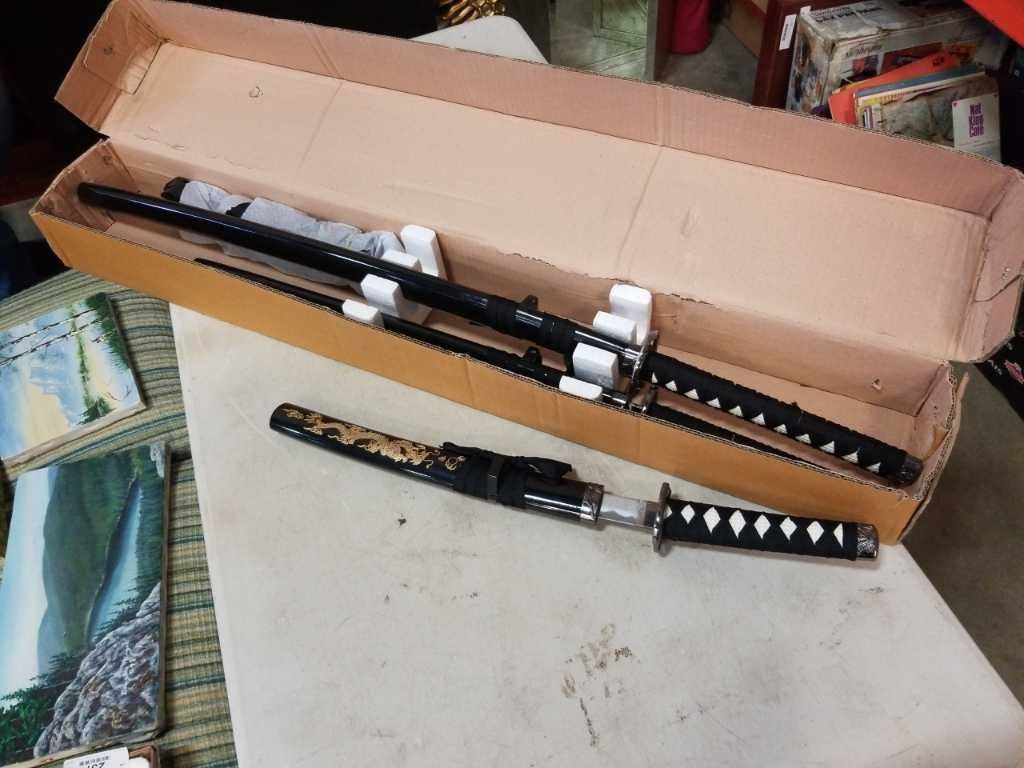 3 PIECE SAMURAI SWORD SET WITH DRAGON SHEATHS AND STAND