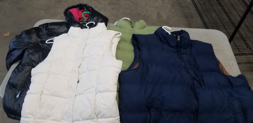 3 PUFFY VESTS AND PUFFY JACKET, SIZE MEDIUM AND LARGE