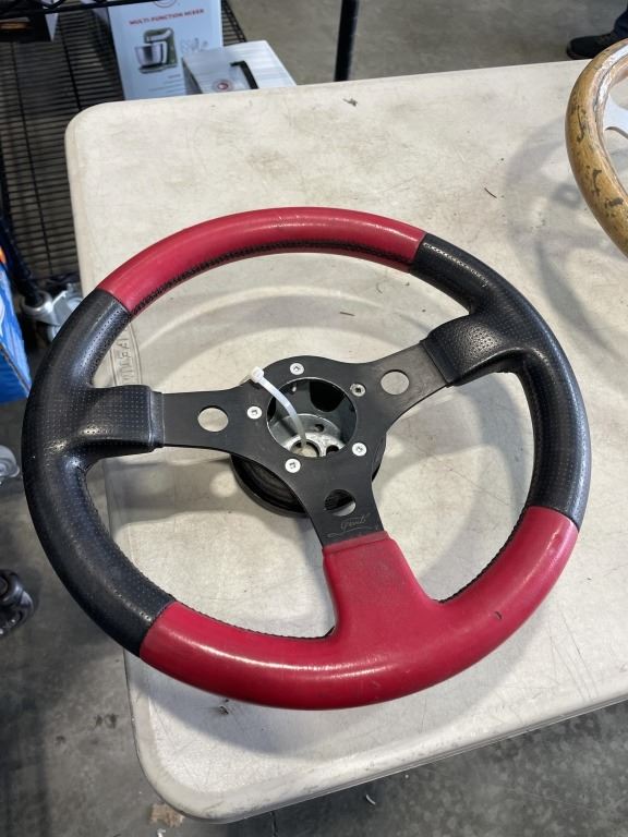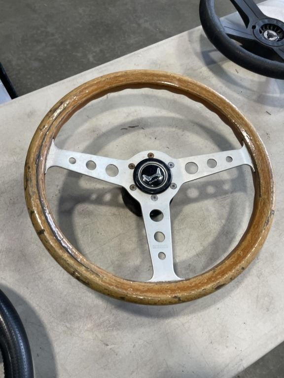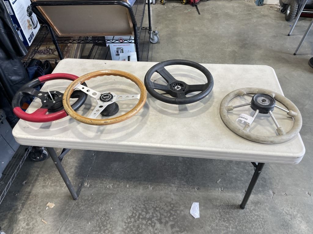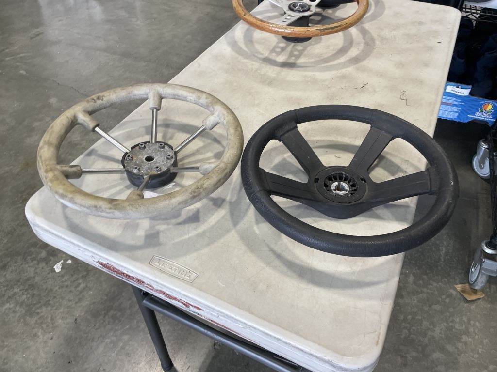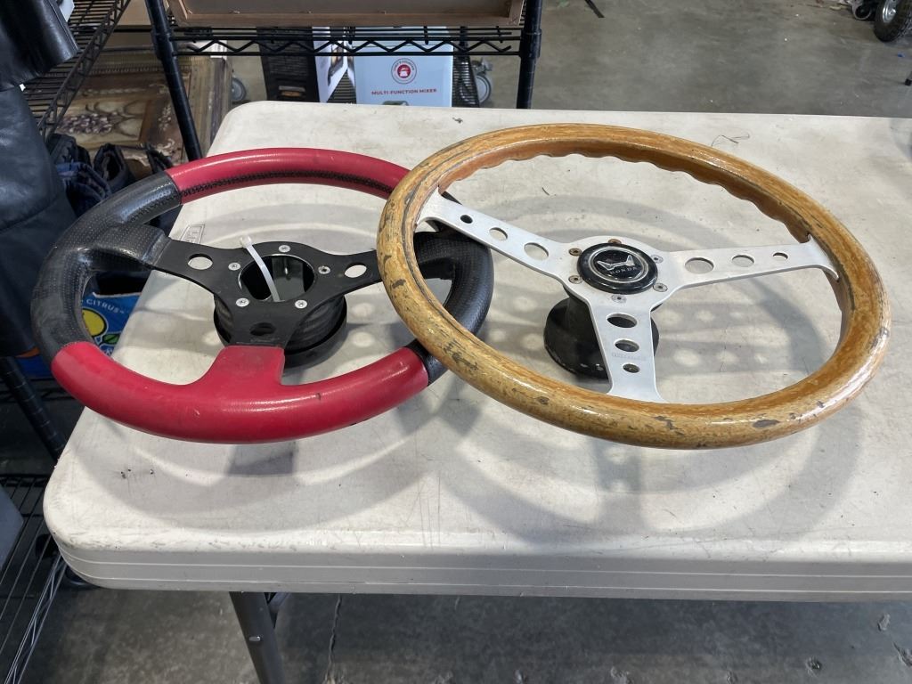 3 RACING STEERING WHEELS AND WOODEN WHEEL