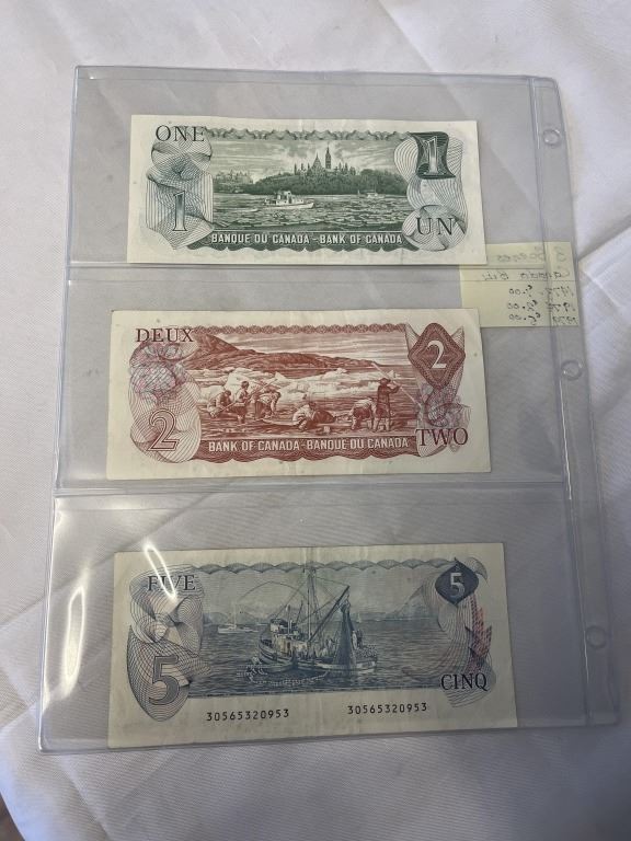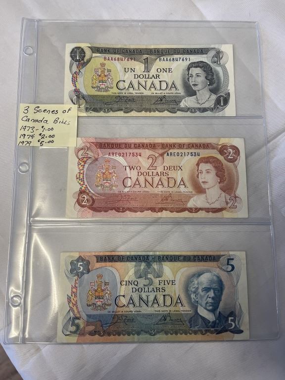 3 SCENES OF CANADA BILLS 1973 $1, 1974 $5, 1979 $5