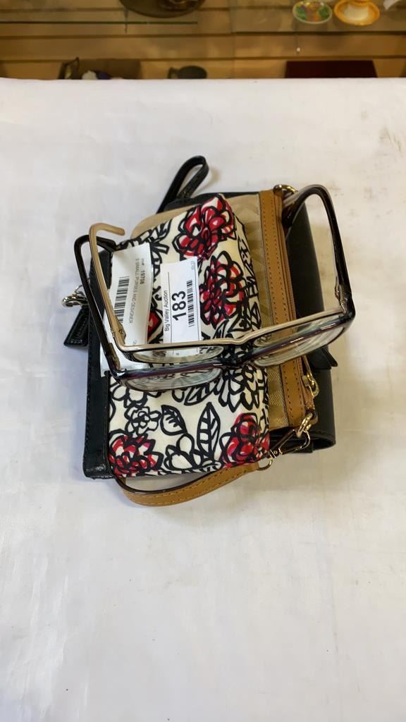 3 SMALL PURSES AND DESIGNER SUNGLASS FRAMES WITH PERSCRIPTION LENSES