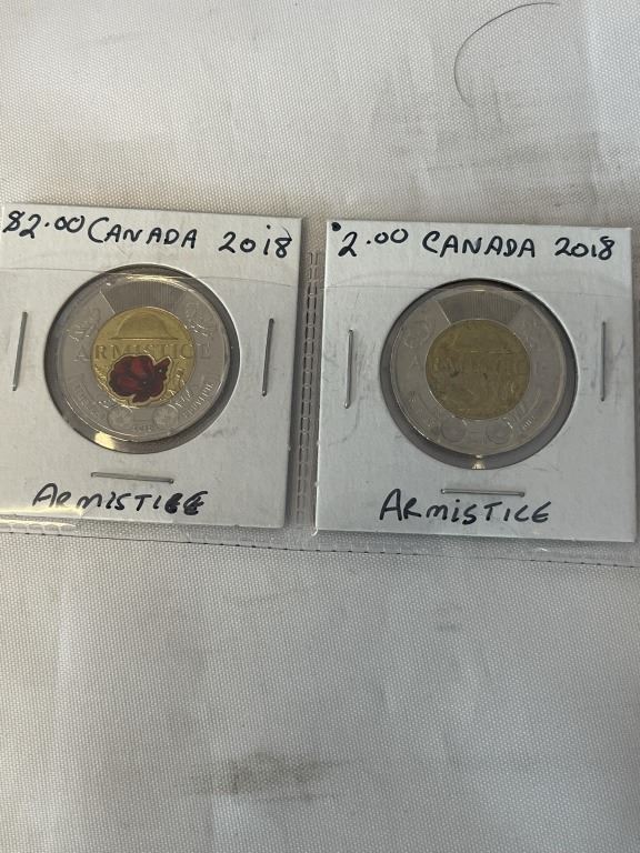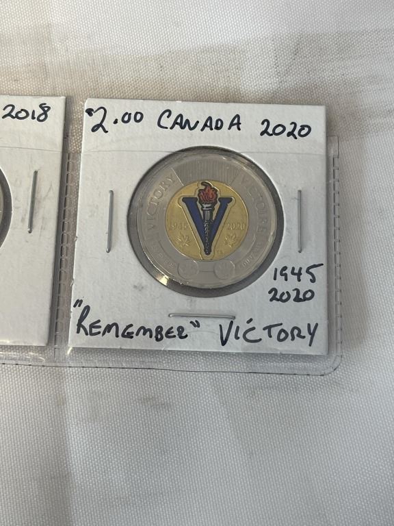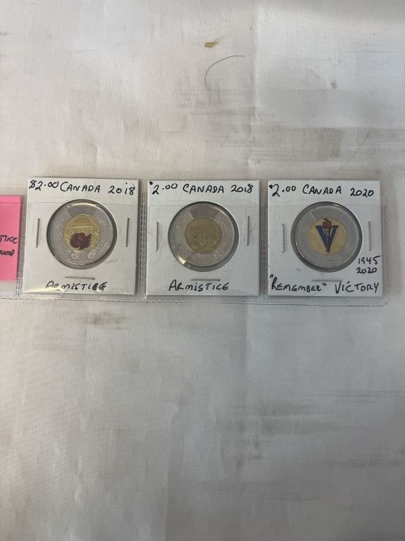 3 SPECIAL CANADIAN $2 COINS 2018 ARMSTICE BOTH TYPES, 2020 VICTORY