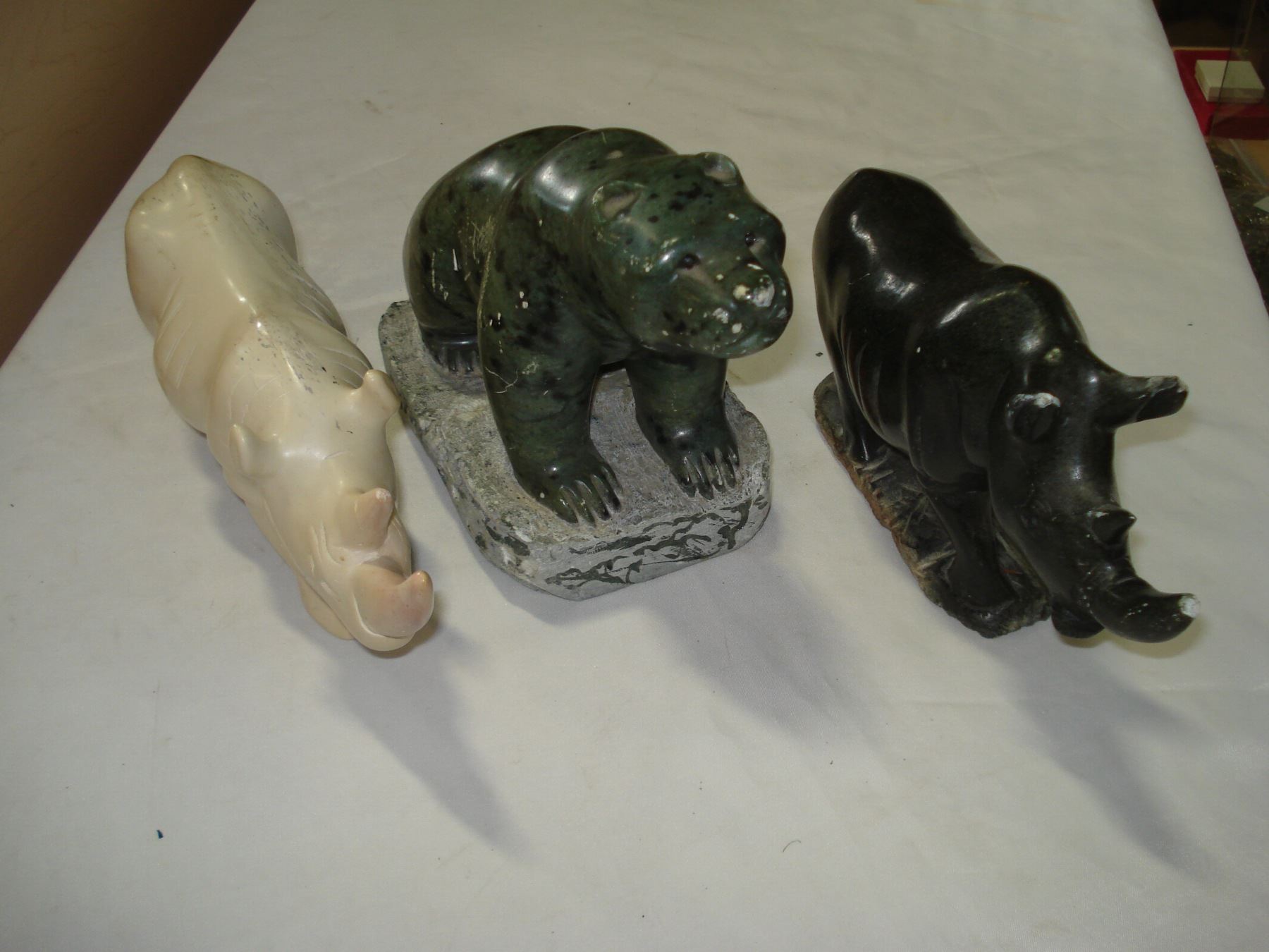 3 STONE FIGURES BEAR AND 2 RHINOS