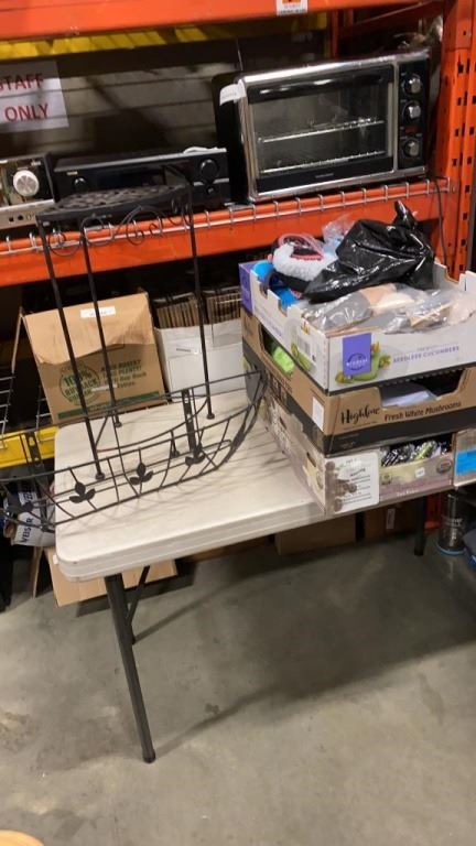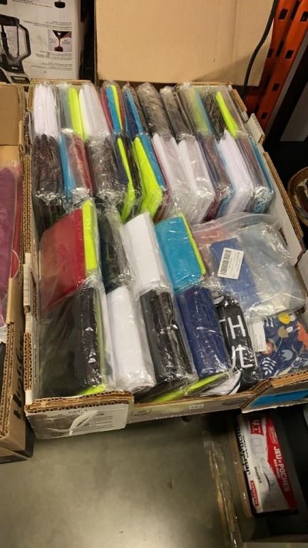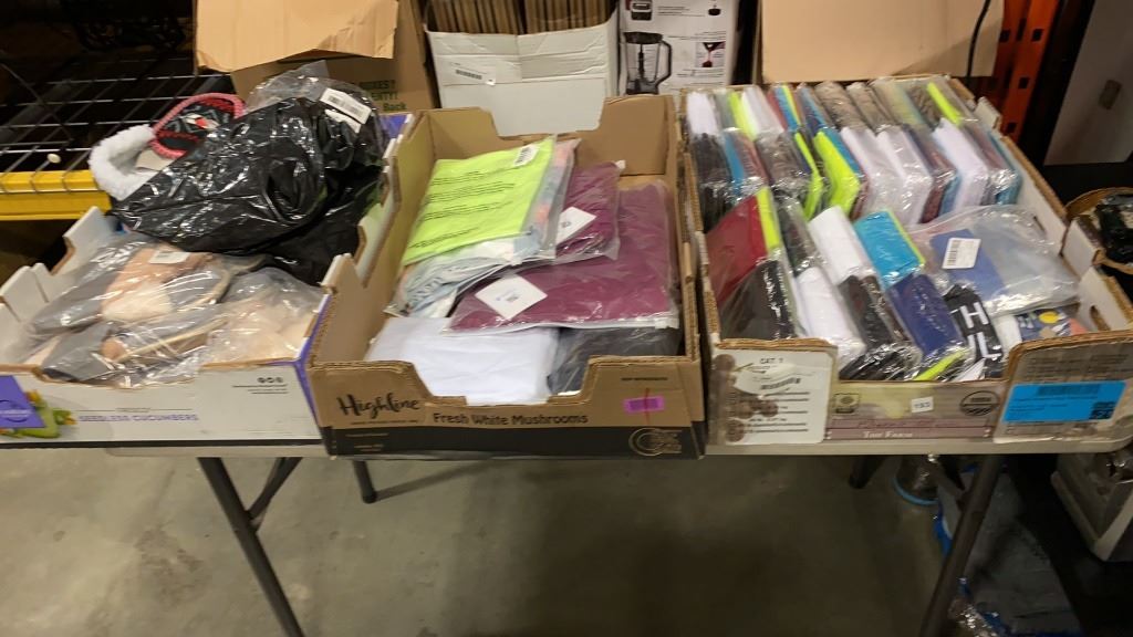 3 TRAY SOF NEW BANDANAS, SHIRTS AND SLIPPERS, PLANTER HOLDER AND METAL STAND