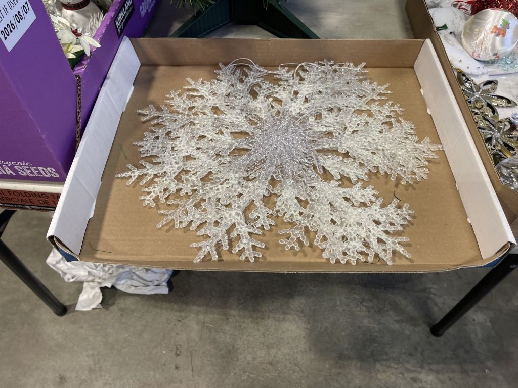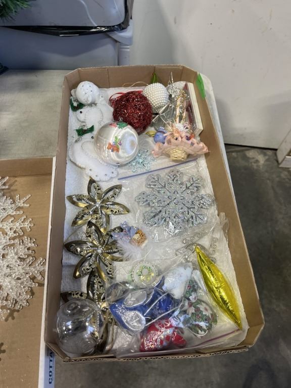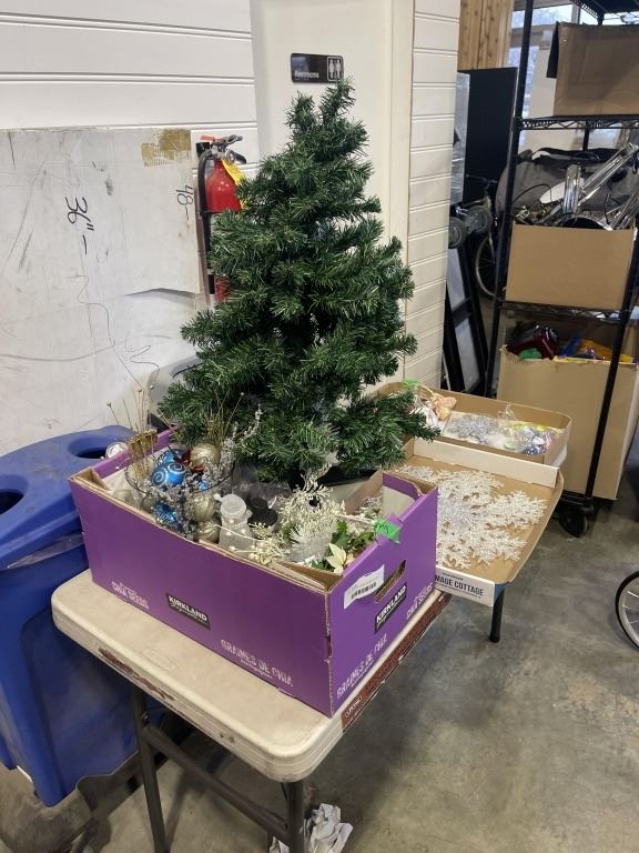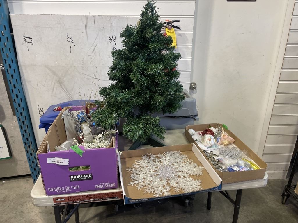 3 TRAYS OF CHRISTMAS DECOR AND MINI CHRISTMAS TREE