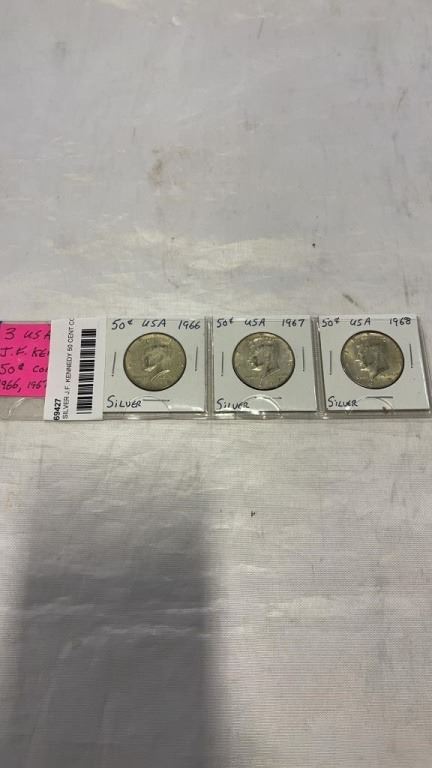 3 USA SILVER J.F. KENNEDY 50 CENT COINS 1966, 1967, 1968