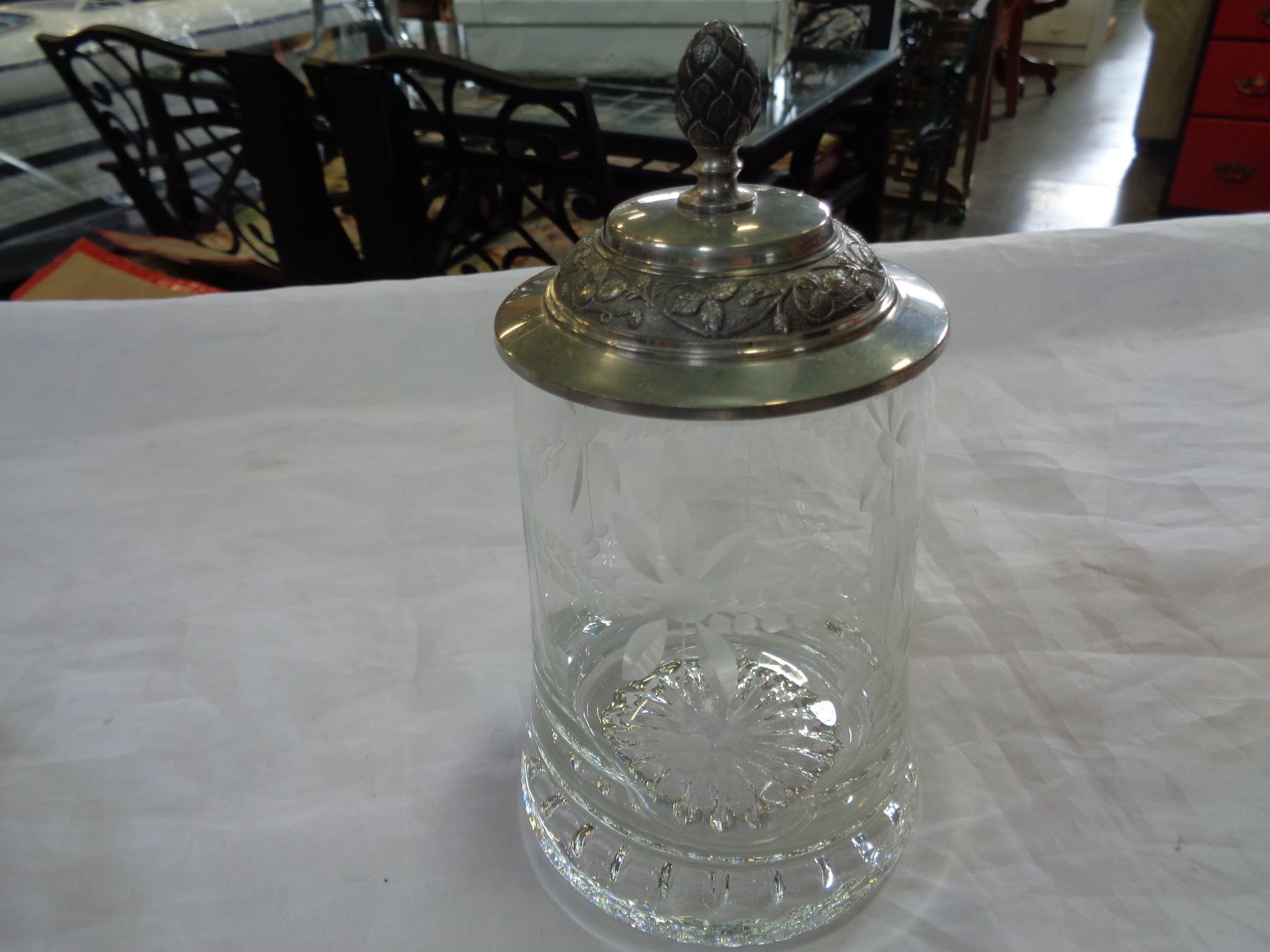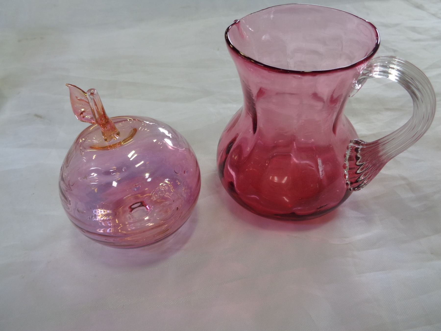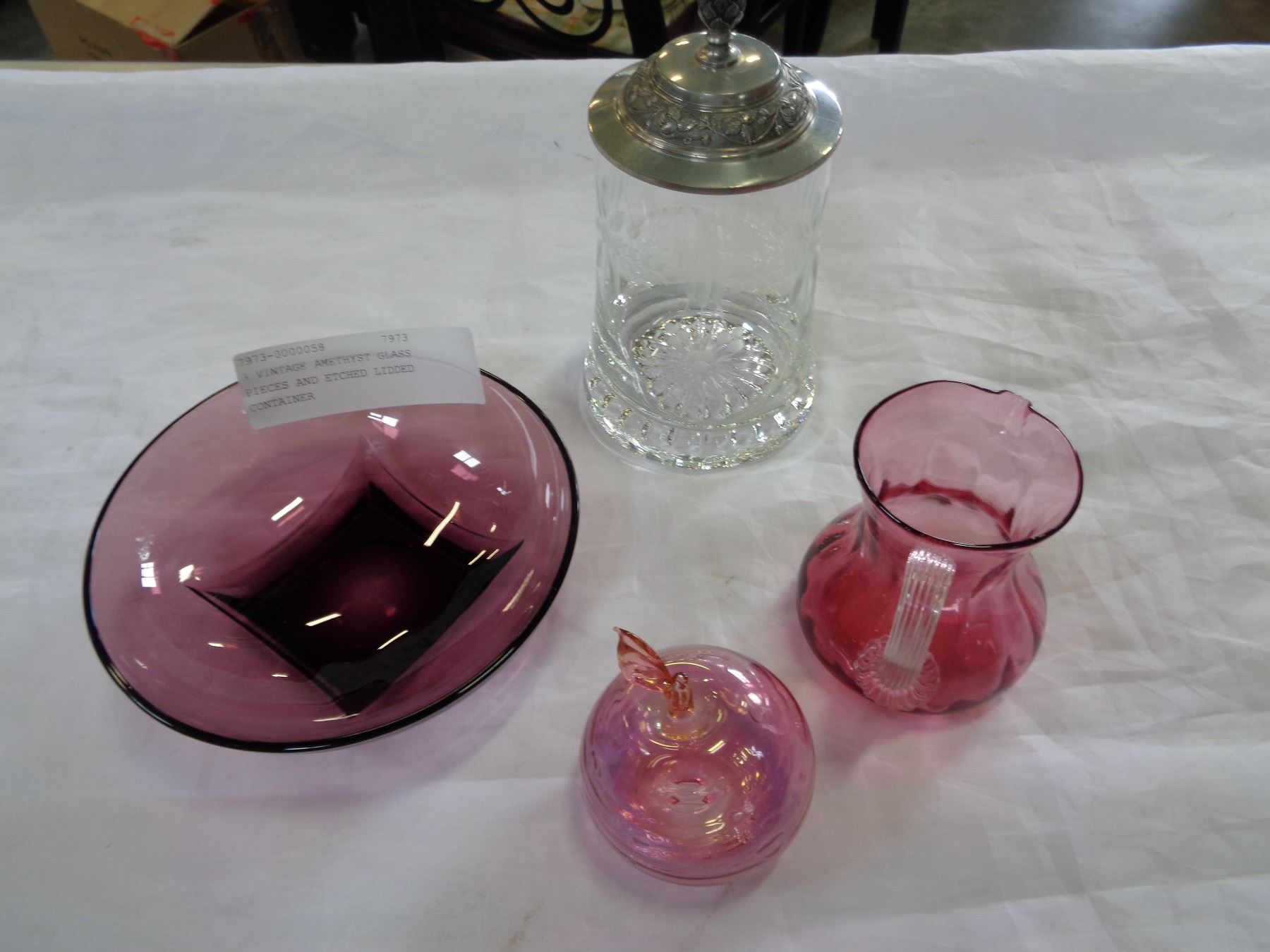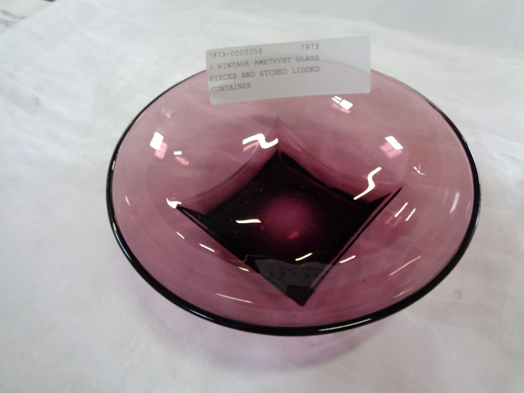3 VINTAGE AMETHYST GLASS PIECES AND ETCHED LIDDED CONTAINER