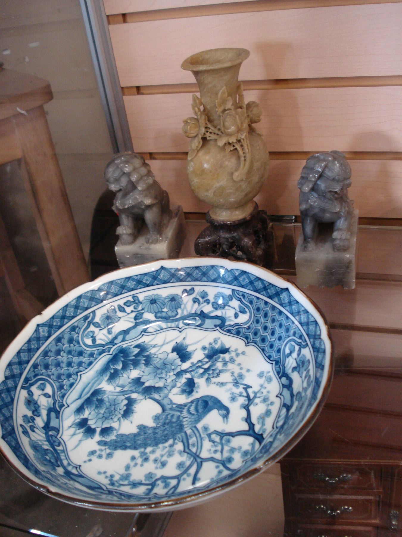3 VINTAGE EASTERN CARVINGS AND BOW