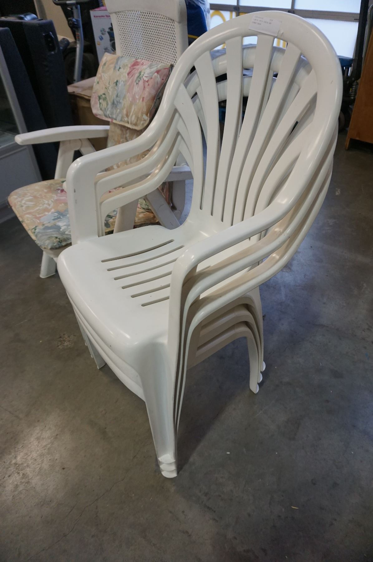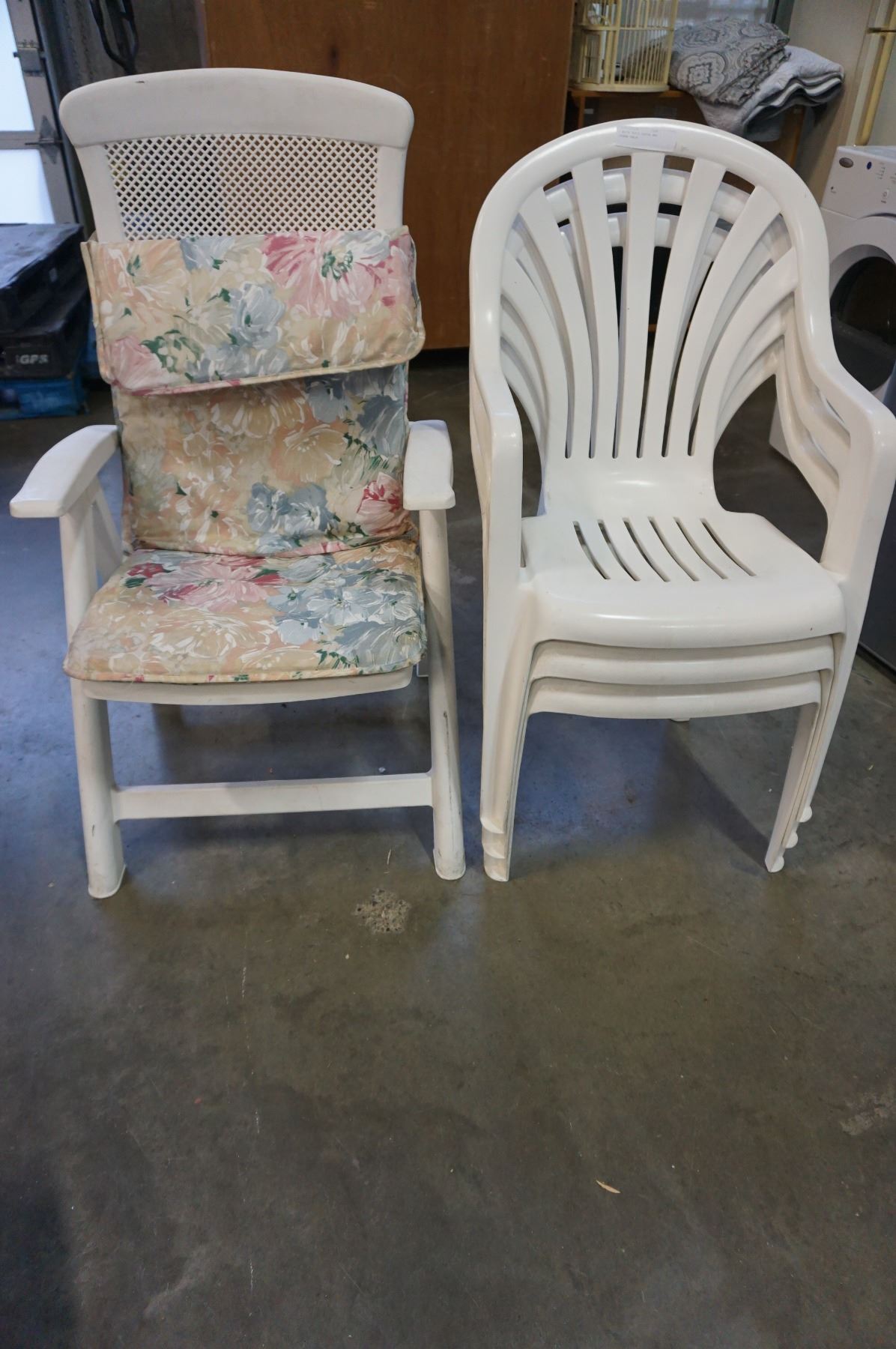 3 WHITE PATIO CHAIRS AND LOUNGE CHAIR