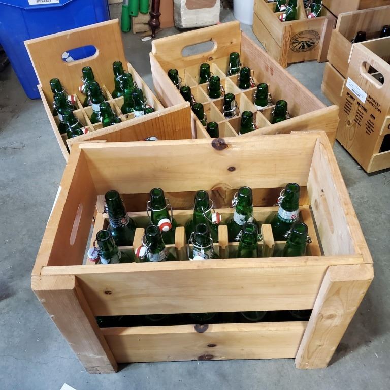 3 WOOD CRATES OF GREEN RESEALABLE WINE BOTTLES