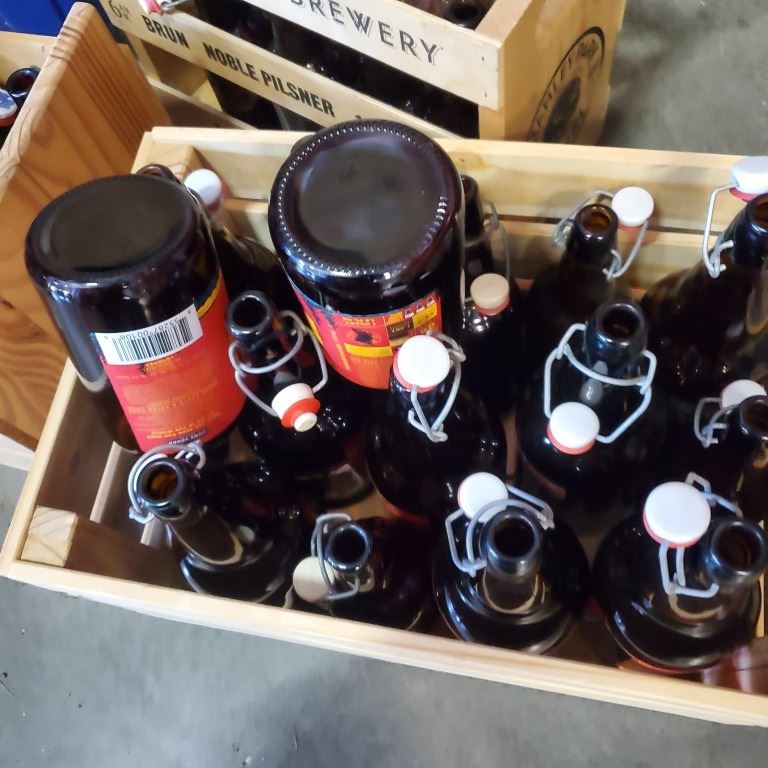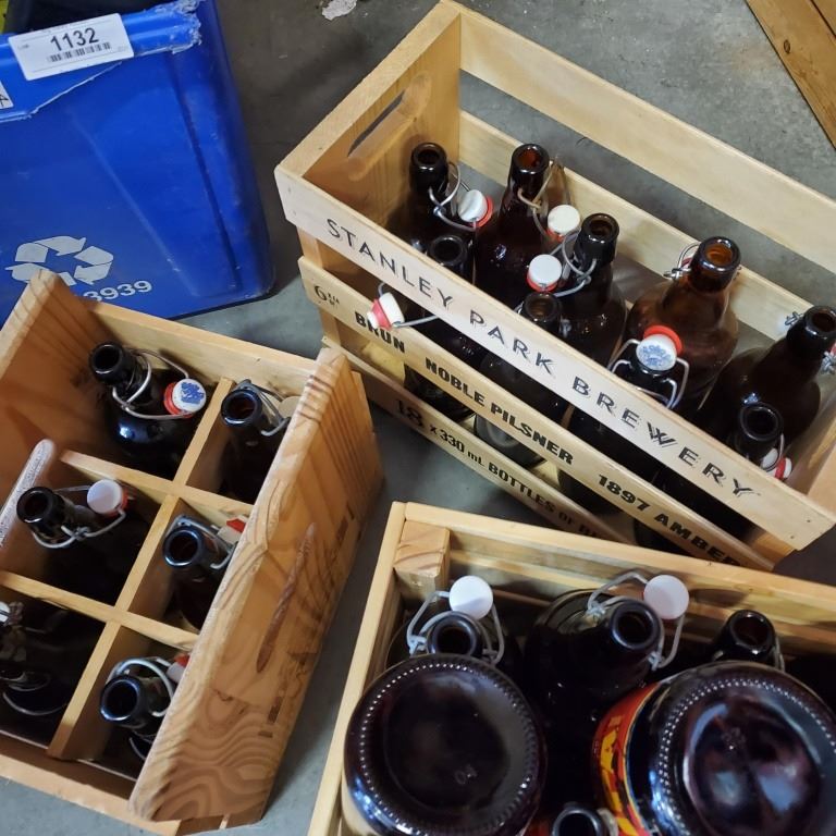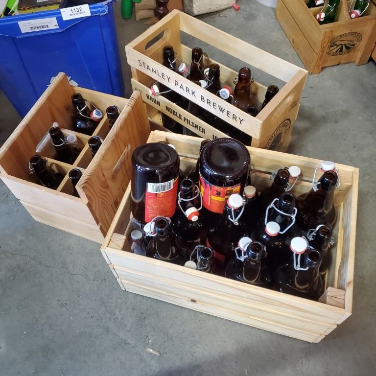 3 WOOD CRATES OFBROWN RESEALABLE WINE BOTTLES