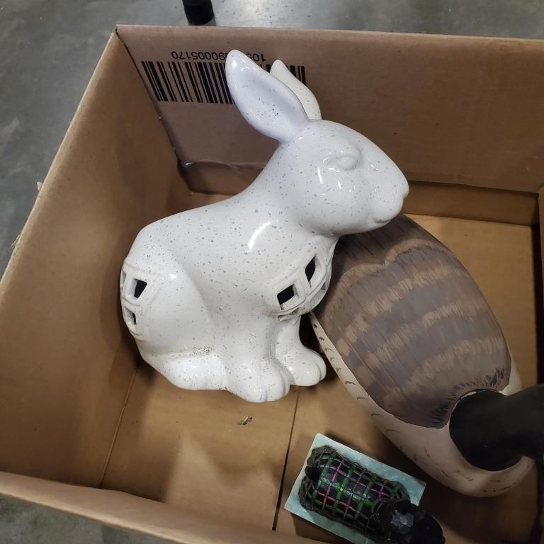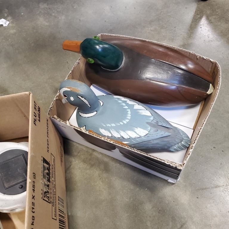 3 WOODEN DUCK DECOYS, AND SOLAR RABBIT GARDEN LIGHT