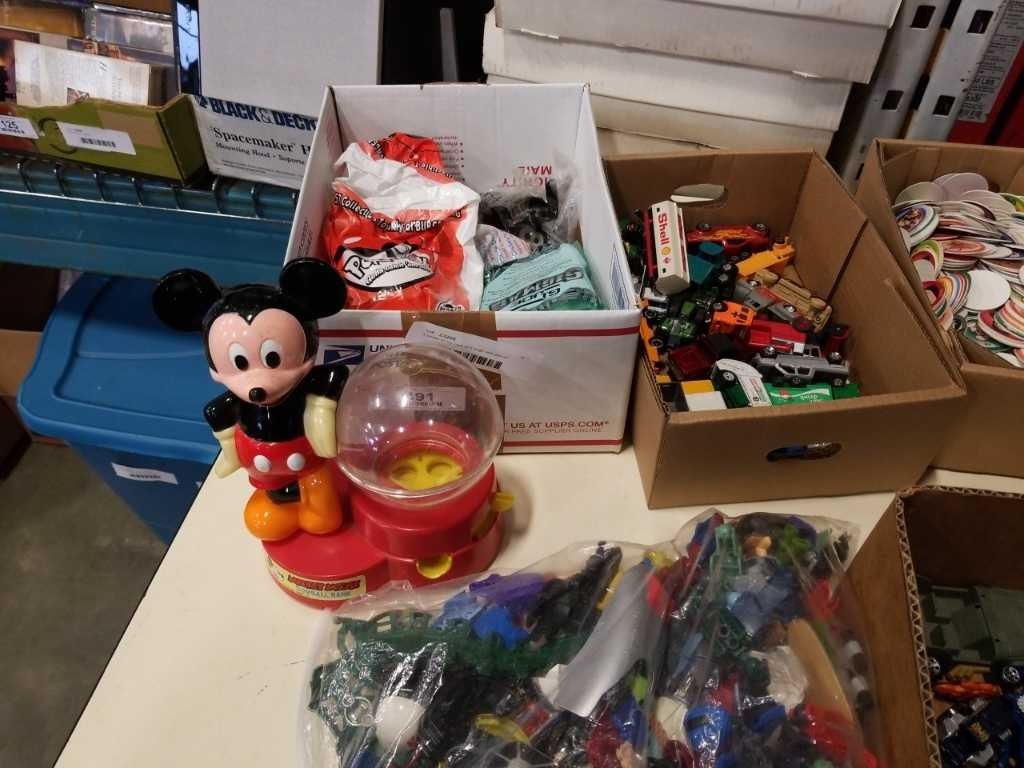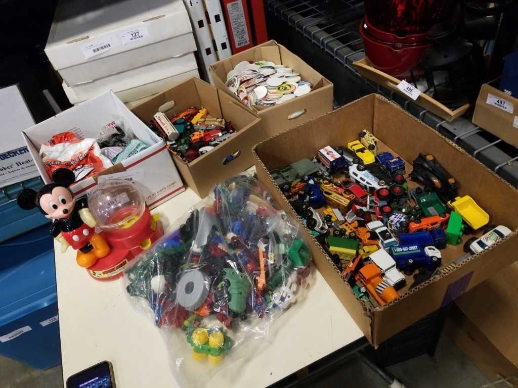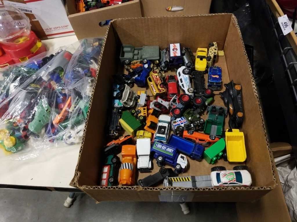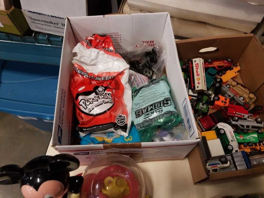 3 boxes of toy cars and pogs with box of mcdonalds toys