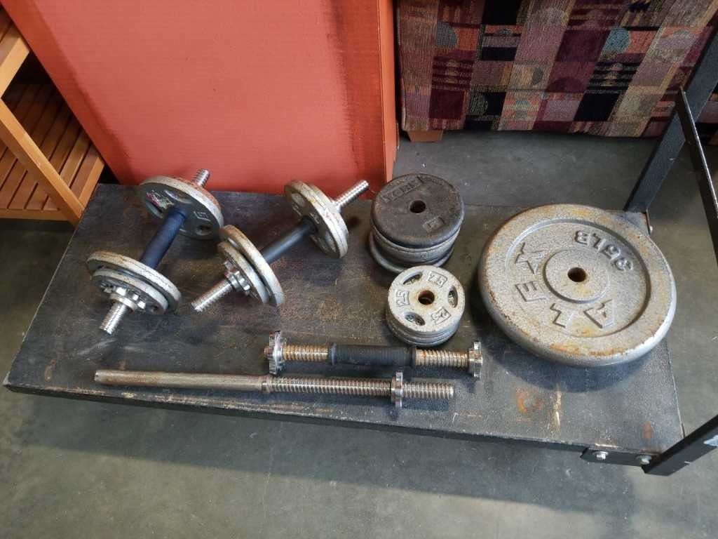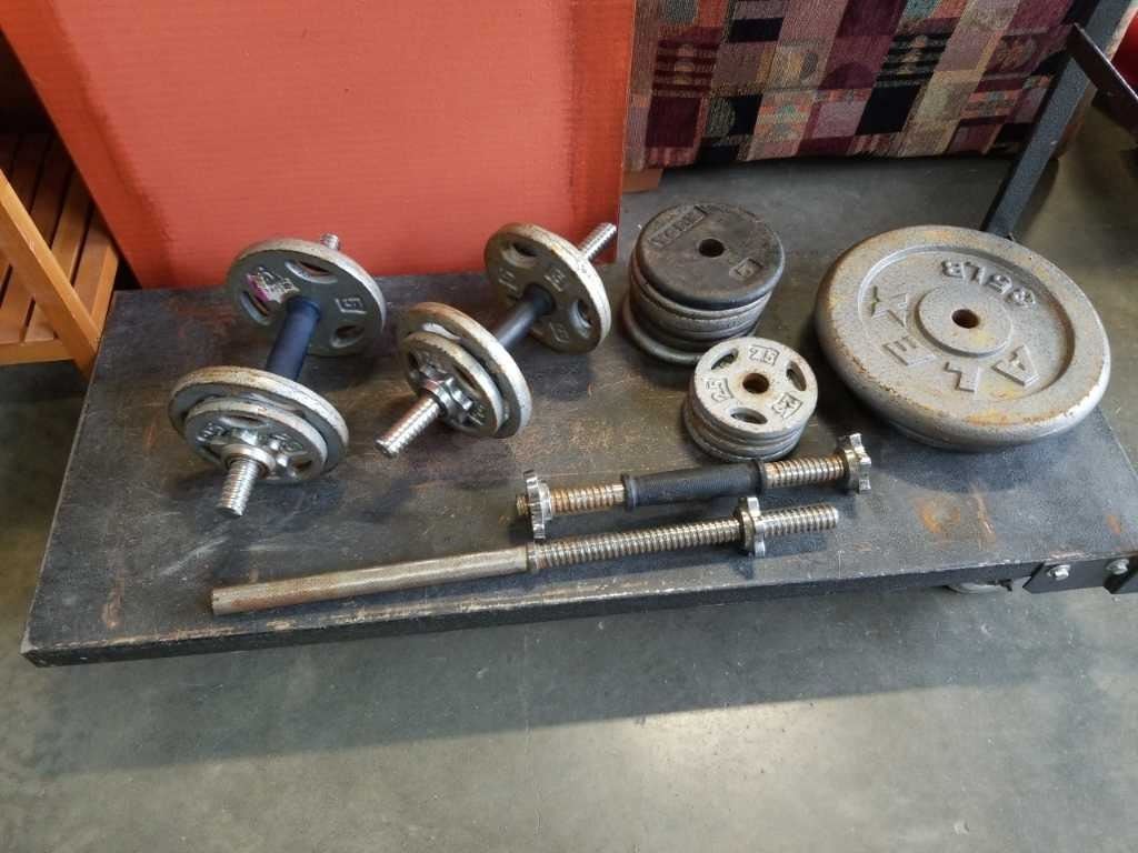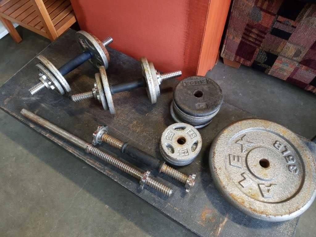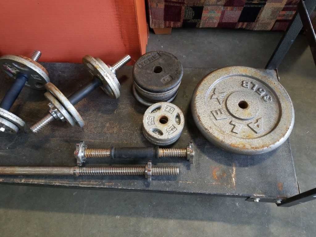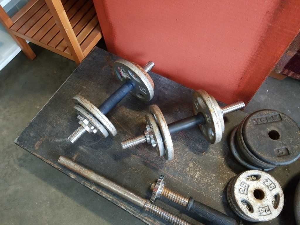 3 dumbbells and tricep bar with 130 lb of plate weight