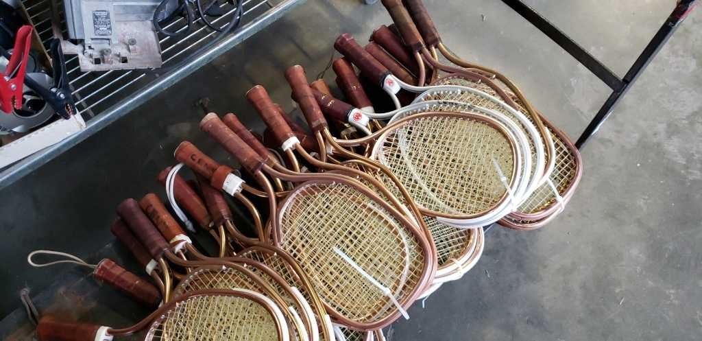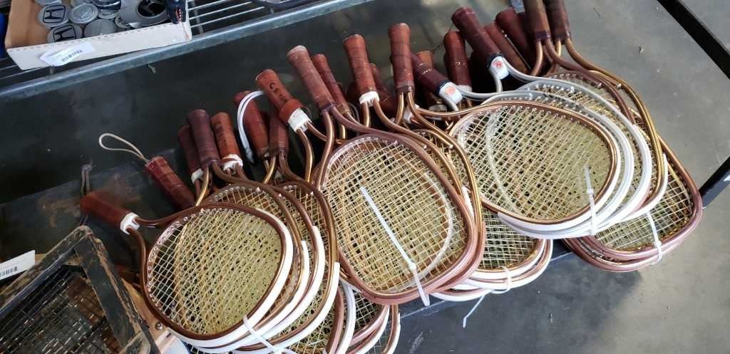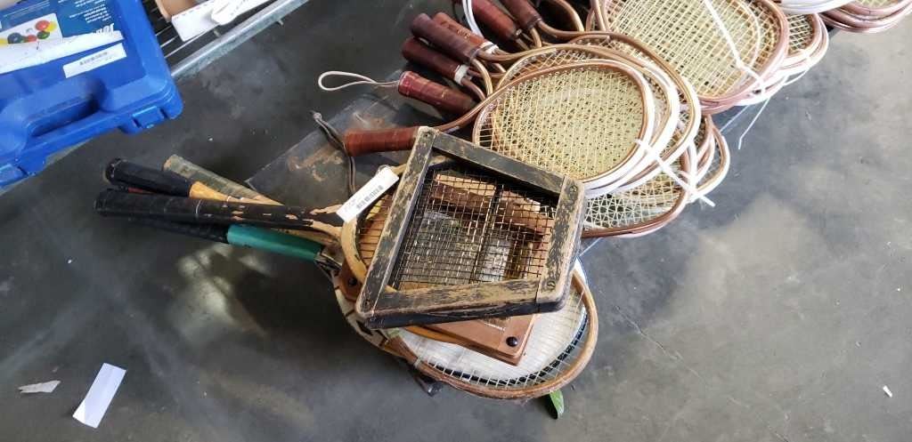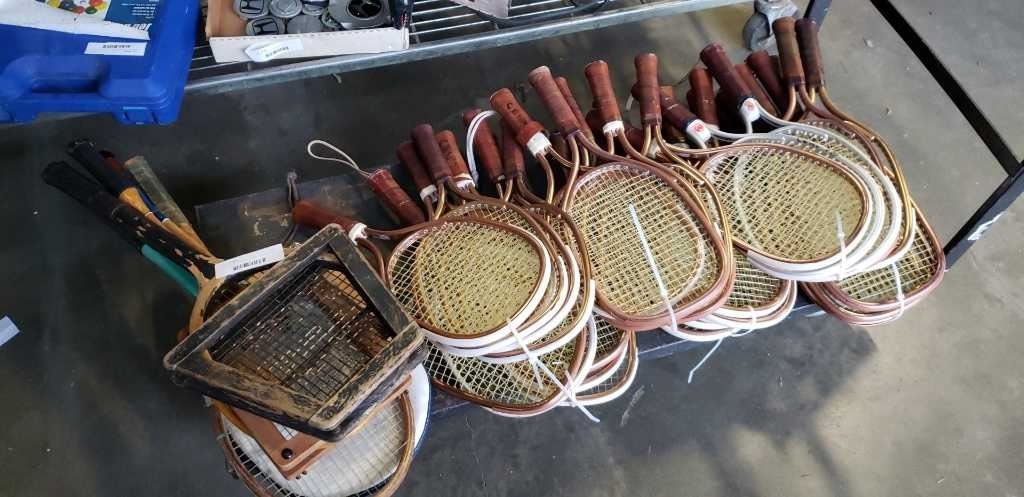 30 racketball rackets & 6 vintage badminton and tennis rackets with guards