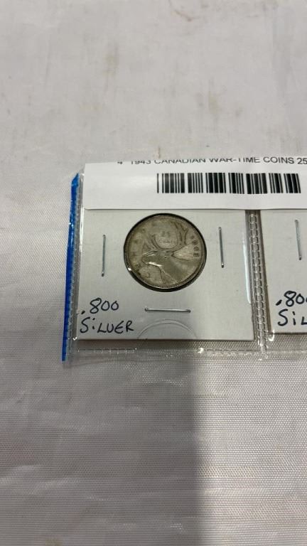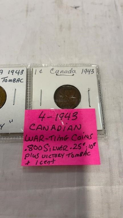 4 1943 CANADIAN WAR-TIME COINS 25 CENT AND 10 CENT - .800 SILVER AND VICTORY 5 CENT AND 1 CENT