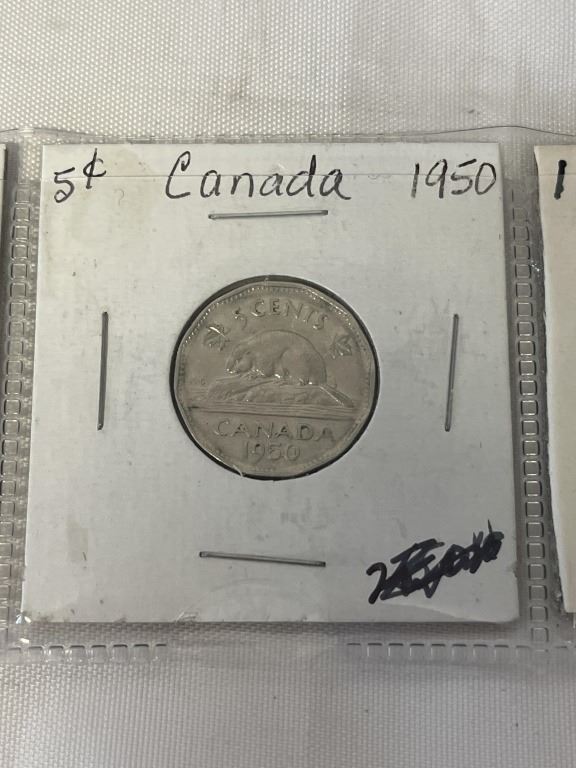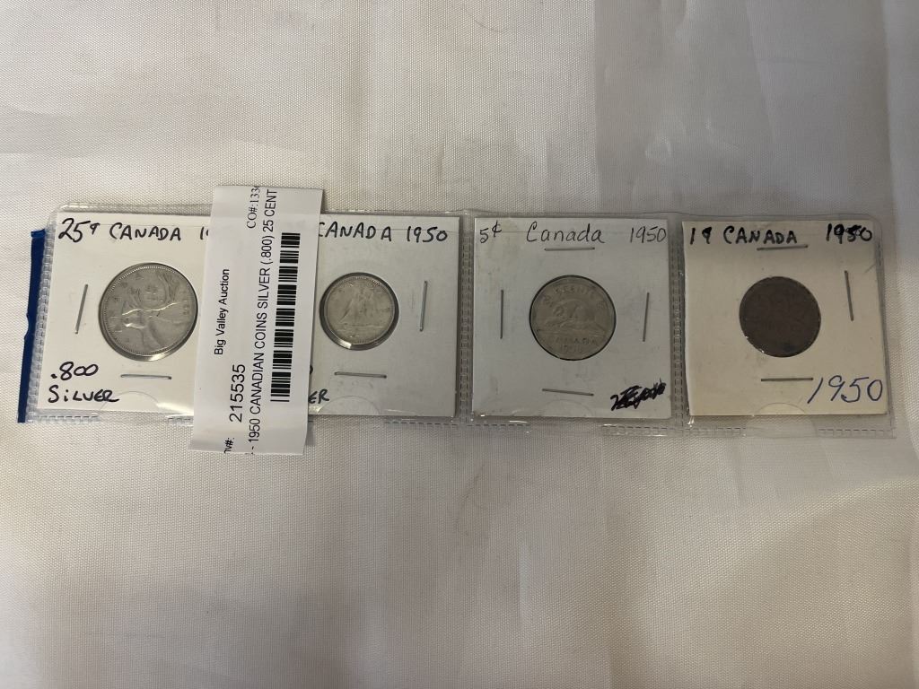 4 - 1950 CANADIAN COINS SILVER (.800) 25 CENT AND 10 CENT PLUS 5 CENT AND 1 CENT