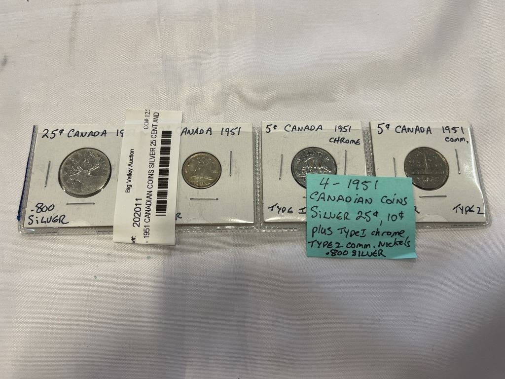 4 - 1951 CANADIAN COINS SILVER 25 CENT AND 10 CENT PLUS 5 CENT AND 1 CENT (.800 SILVER)