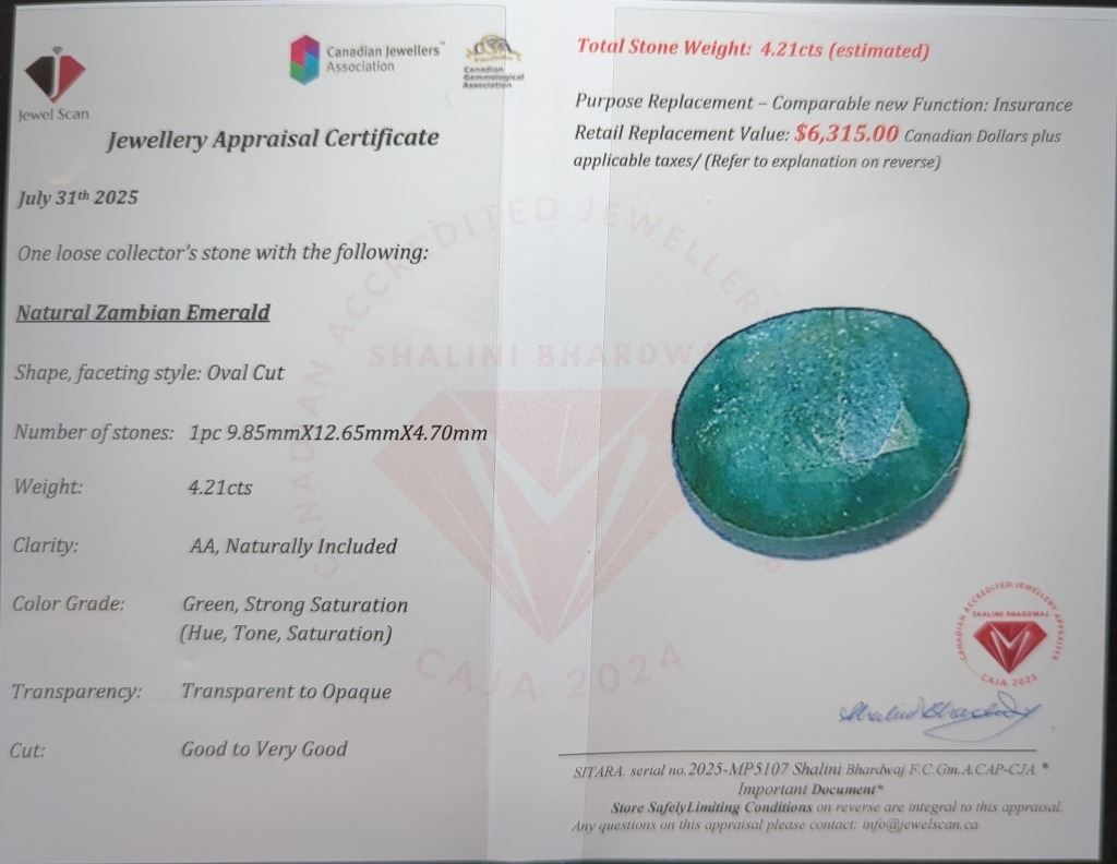 4.21 CT AUTHENTICATED EMERALD GEMSTONE ($6,315 APPRAISAL)