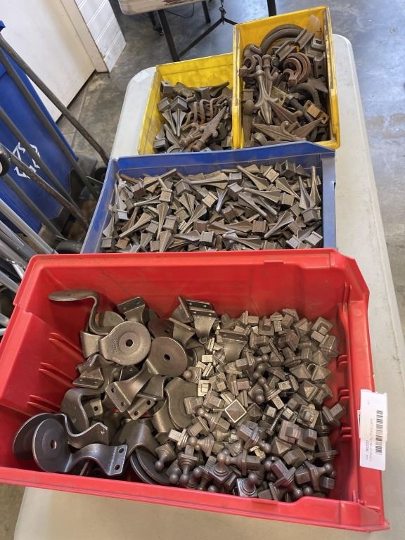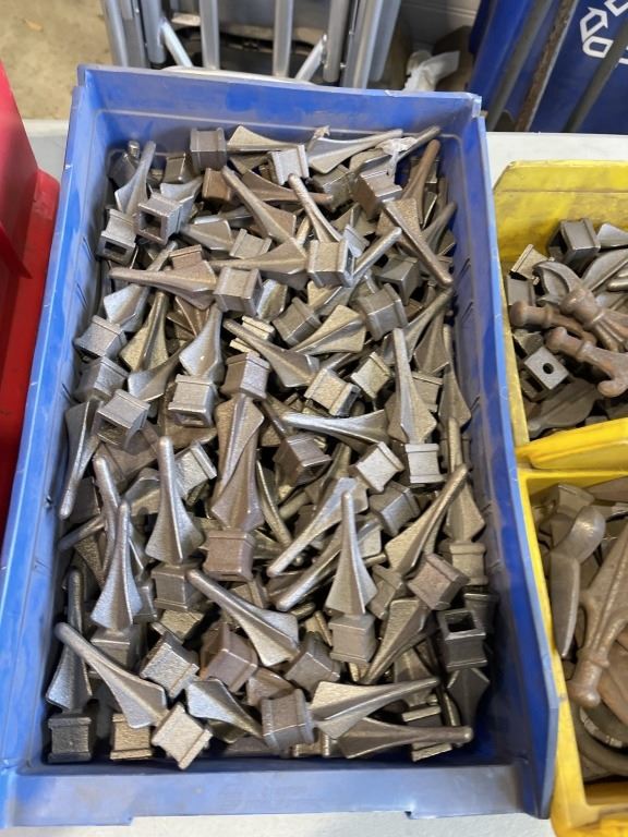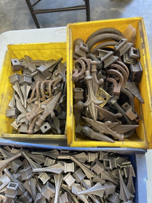 4 BINS OF DECORATIVE METAL FENCE CAPS