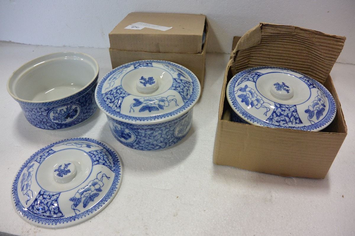 4 BLUE & WHITE PORCLEAN SERVING BOWLS W/ LIDS
