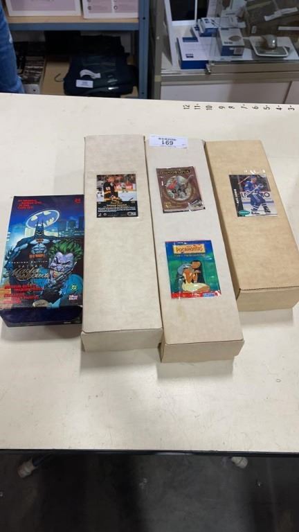 4 BOXES OF COLLECTOR CARDS, SPORTS CARDS, BATMAN MASTER SERIES CARDS, POCOHONTAS, DINOSAUR CARDS, SPORT PUZZLE CARDS
