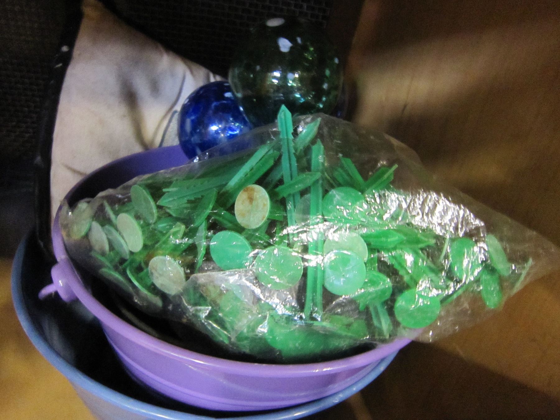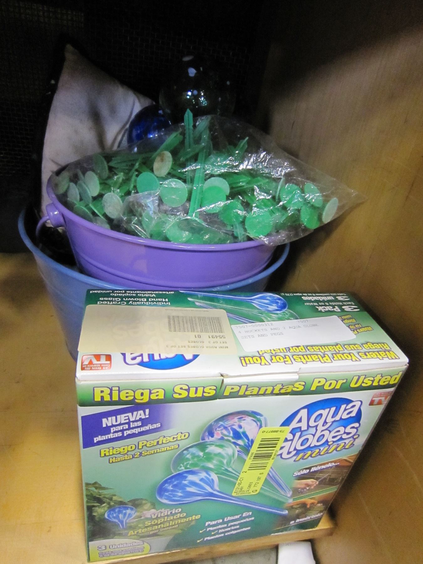 4 BUCKETS AND 2 AQUA GLOBE SETS AND PEGS
